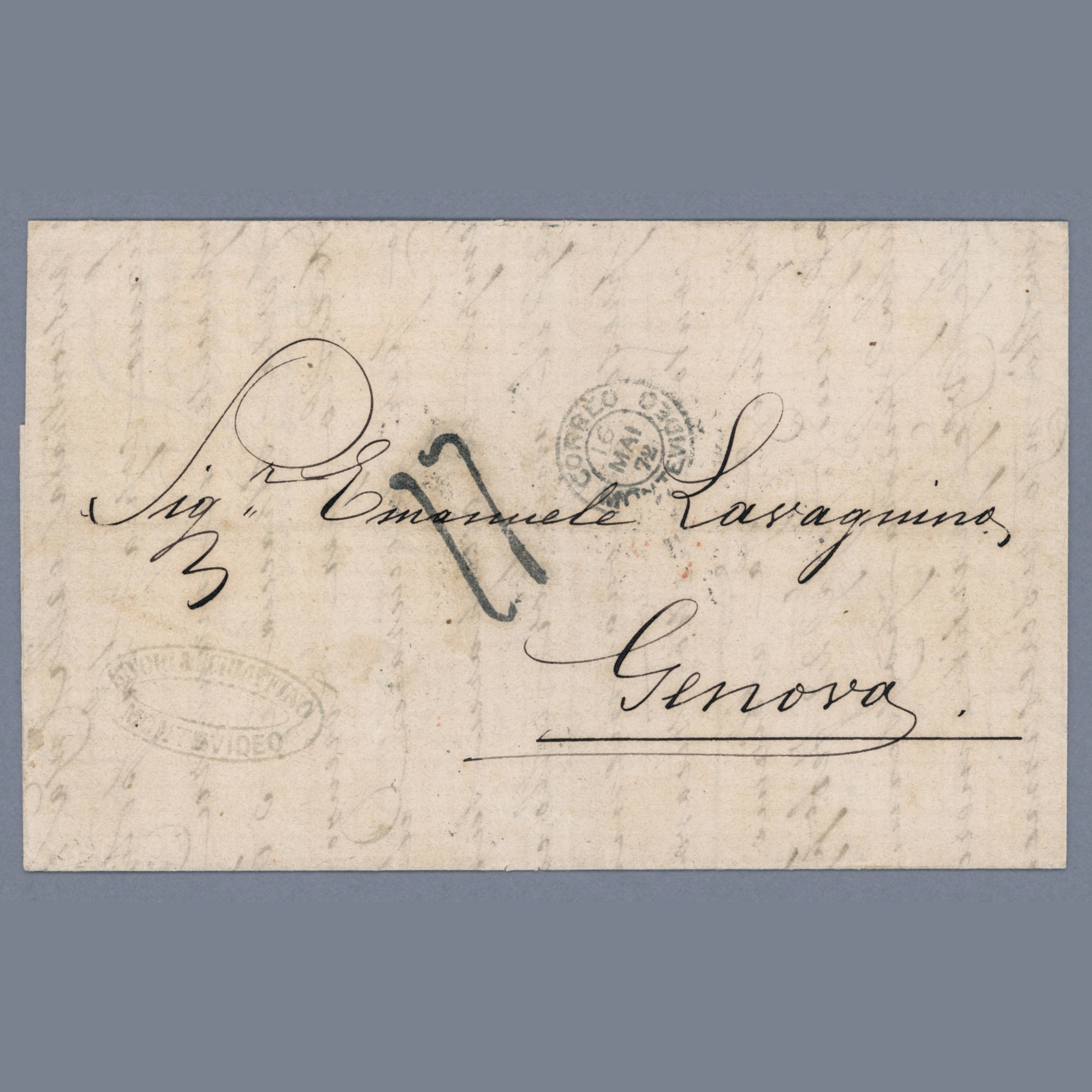 1872 Italy – Uruguay – Letter from Montevideo to Genoa with very high 1,70 lire Italian postage due