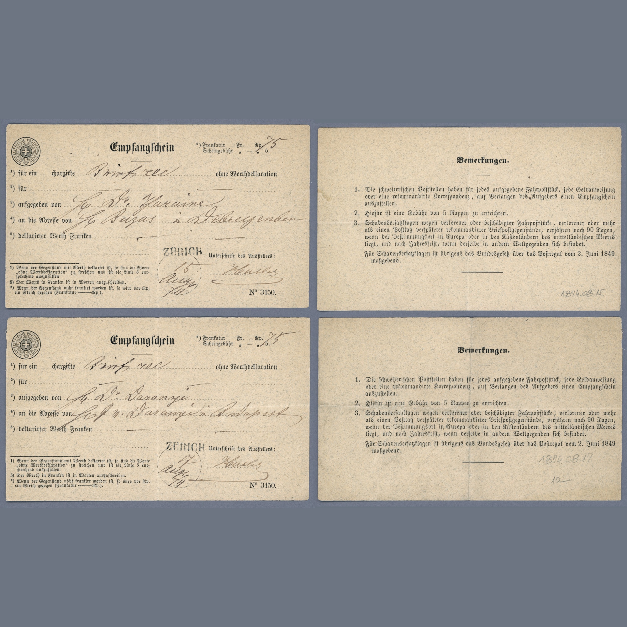 1874 Switzerland – Two return receipts for registered letters sent to Hungary. – better destination
