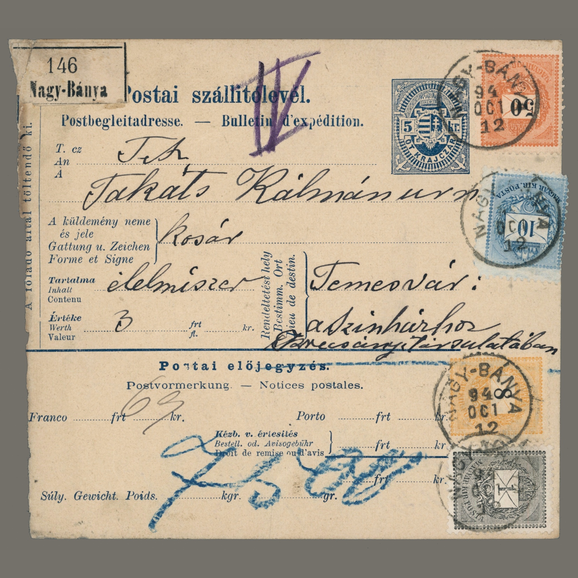 1894 Hungary – Parcel card for a value-insured 8 kg weight long distance (zone III) parcel sent to Timisoara. Delivered to Mr. Kálmán Takács at the theatre in Timisoara.