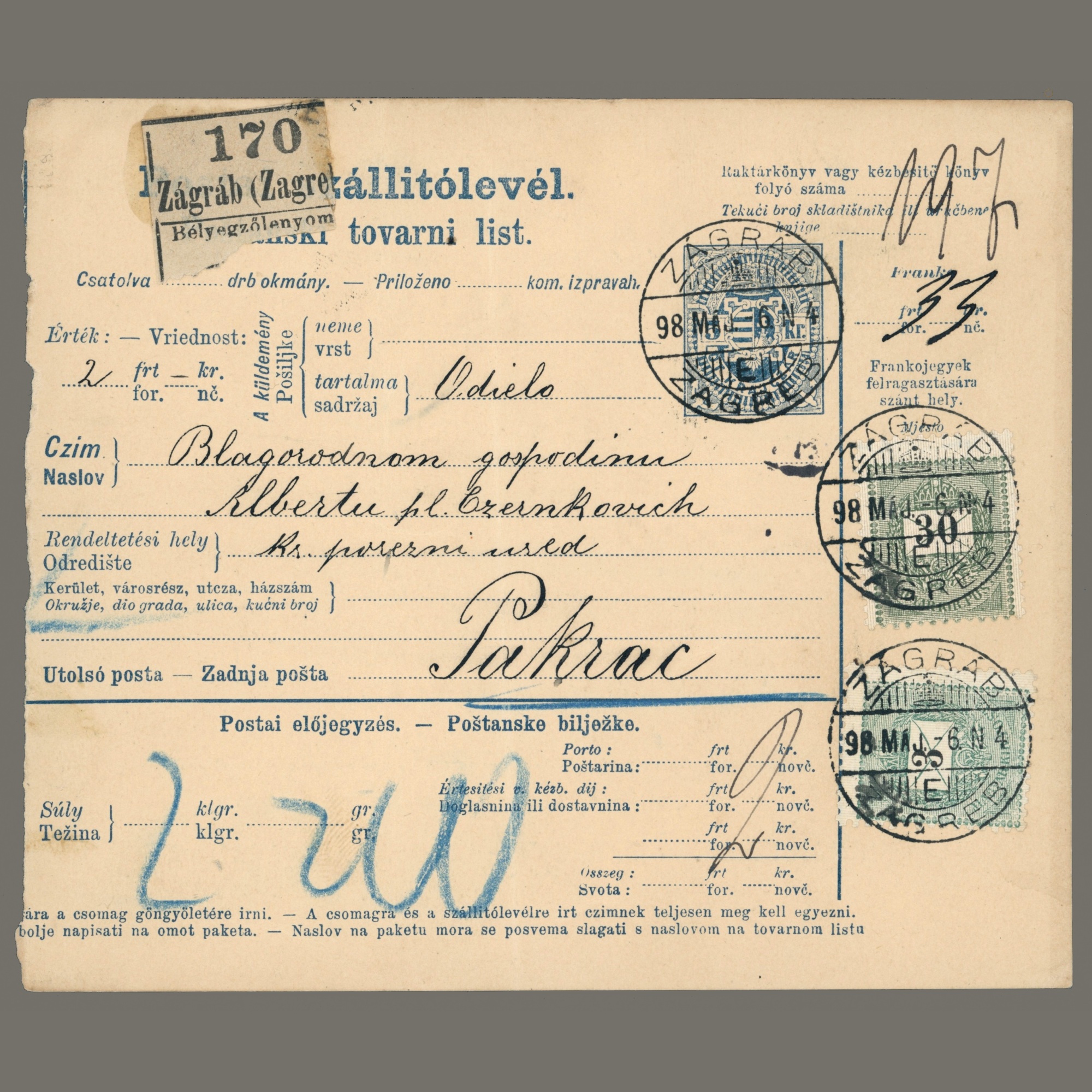 1898 Hungary – 5 kg value-insured parcel from Zagreb to Pakrac (distance zone II), rare Croatian-Hungarian postal form