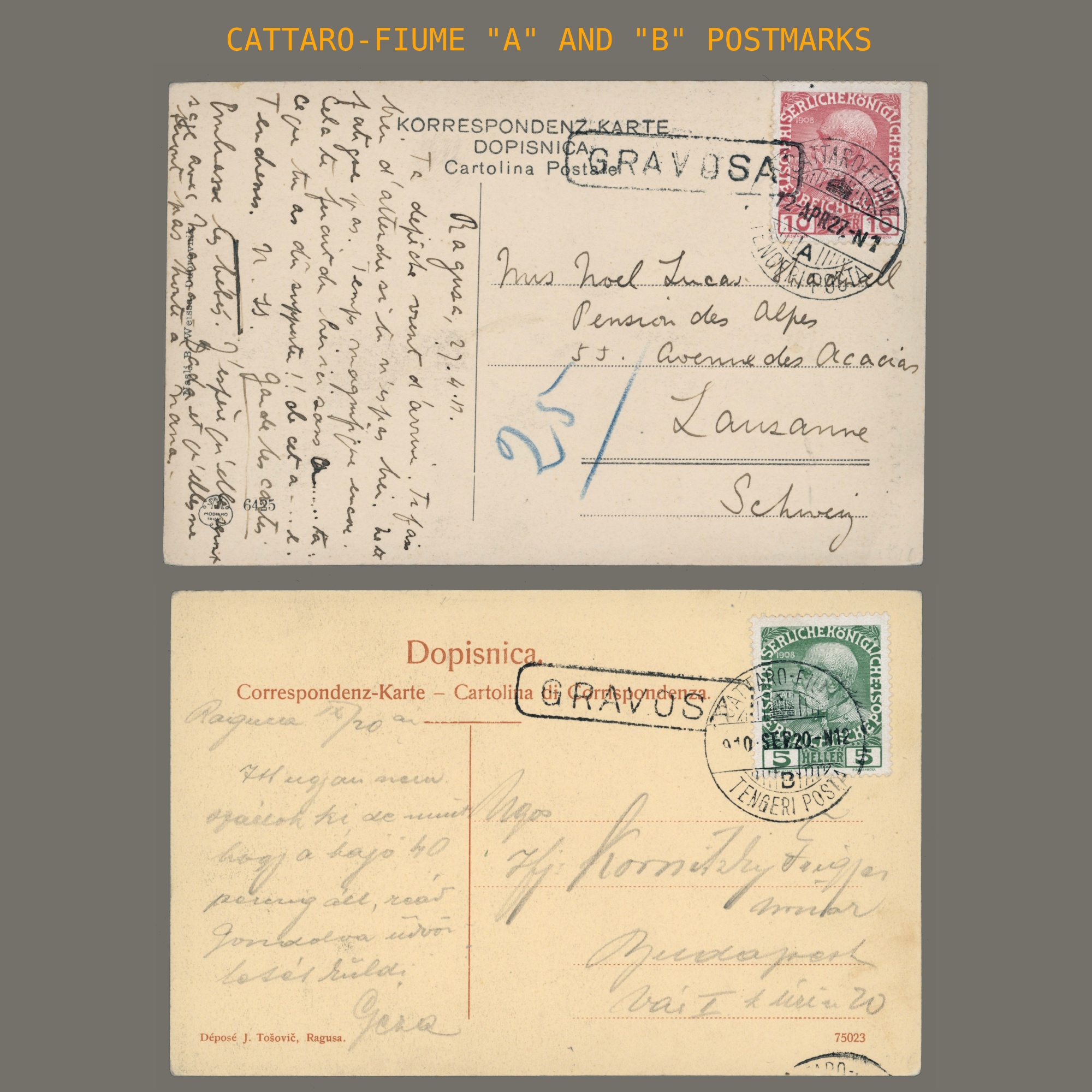 1910-1912 Fiume – CATTARO FIUME – TENGERI POSTA / A and B ship postmarks + GRAVOSA port postmark