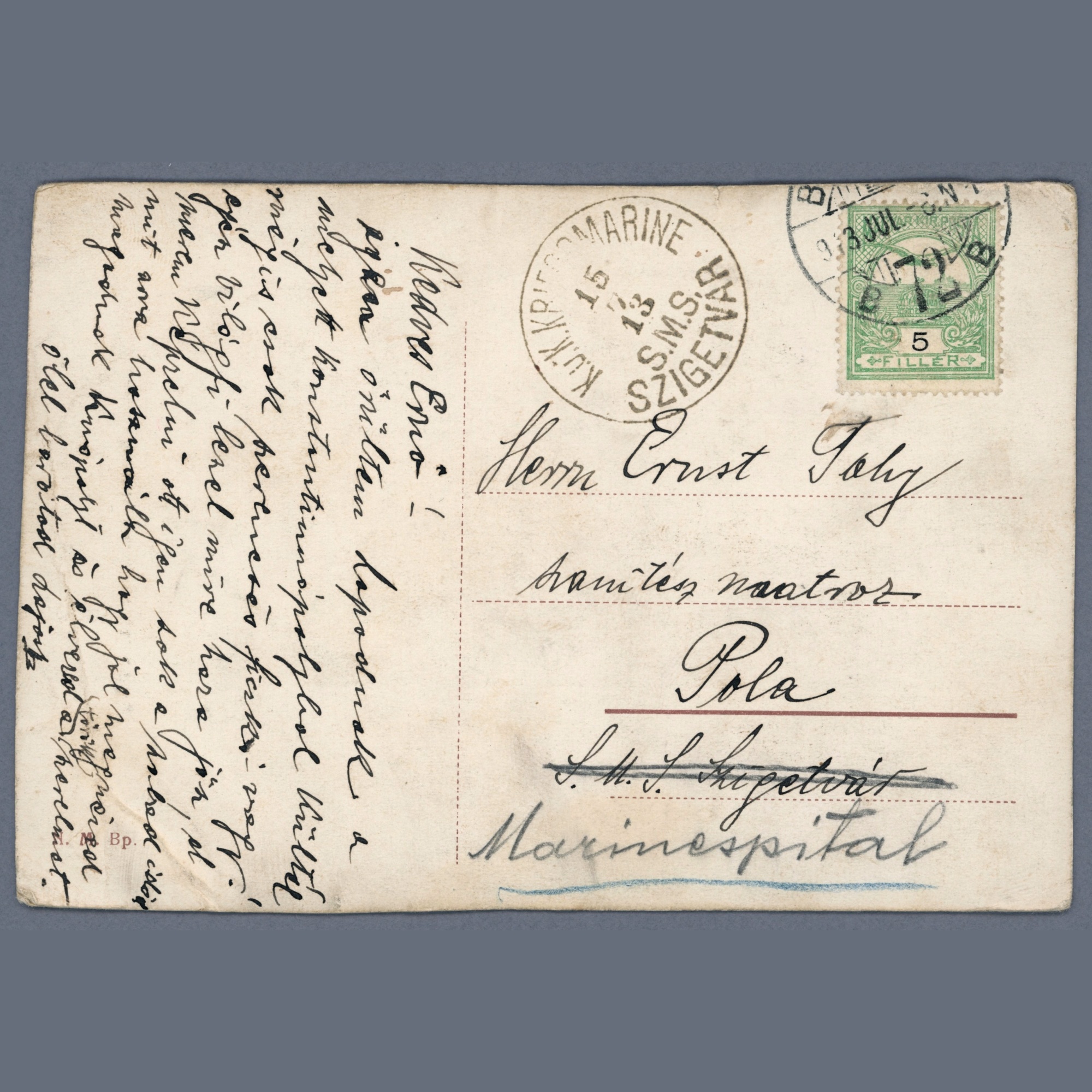1913 Austria – Postcard with a nice “SMS Szigetvár” ship postmark sent to a sailor on the Szigetvár ship.