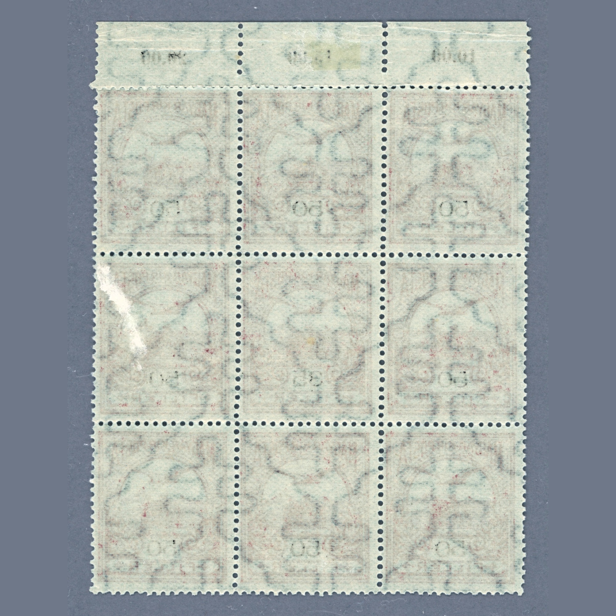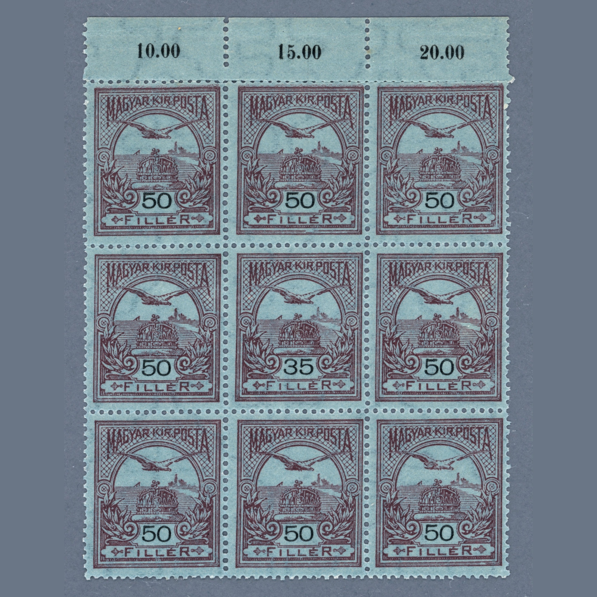 1913 Hungary – Turul 35/50 fillér misprint, mint block of nine | Phu: 151Tny / 500 EUR