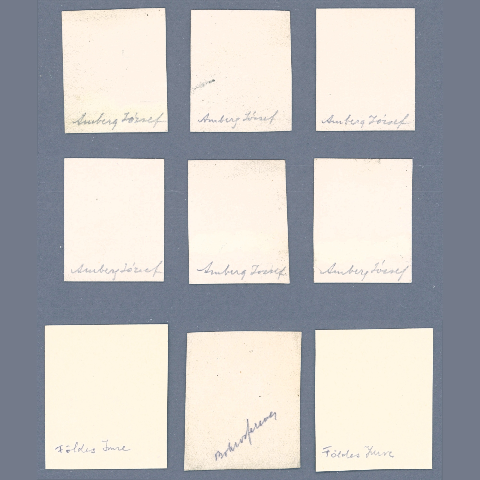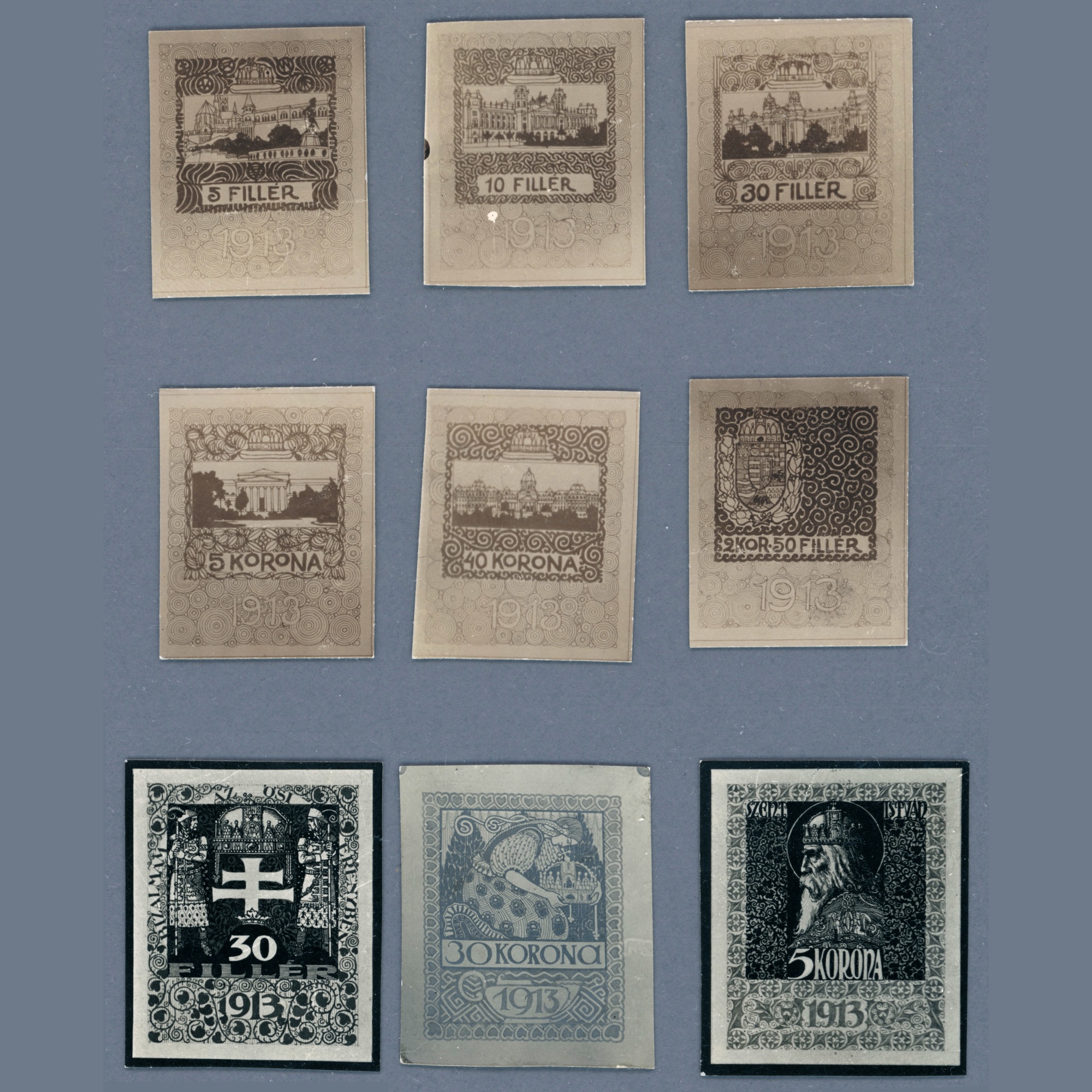 Six unrealised stamp designs by József Amberg, Ferenc Bokros and Imre Földes. The stamp design for 30 filler was the work of Imre Földes, which was realised on the 6-50 koruna denominations. Presumably with the designers’ signatures.