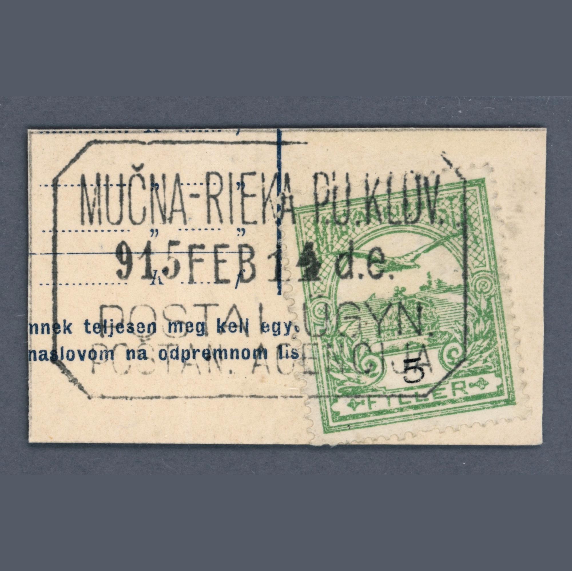 1915 Hungary – MUČNA-RIEKA P.U.KLDV. bilingual Hungarian – Croatian postal agency railway station postmark | PÜ: 200 points