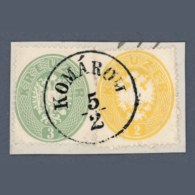 1863 Austria – 2 + 3 krajcar with luxury KOMÁROM postmark on cutout