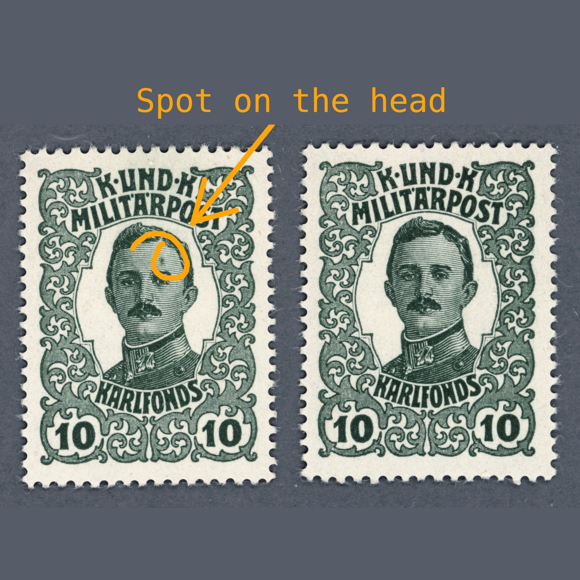 1918 Austria – K.u.K. Militarpost – Charles IV. mint hinged * 10 heller stamp with spot on the forehead misprint + reference item