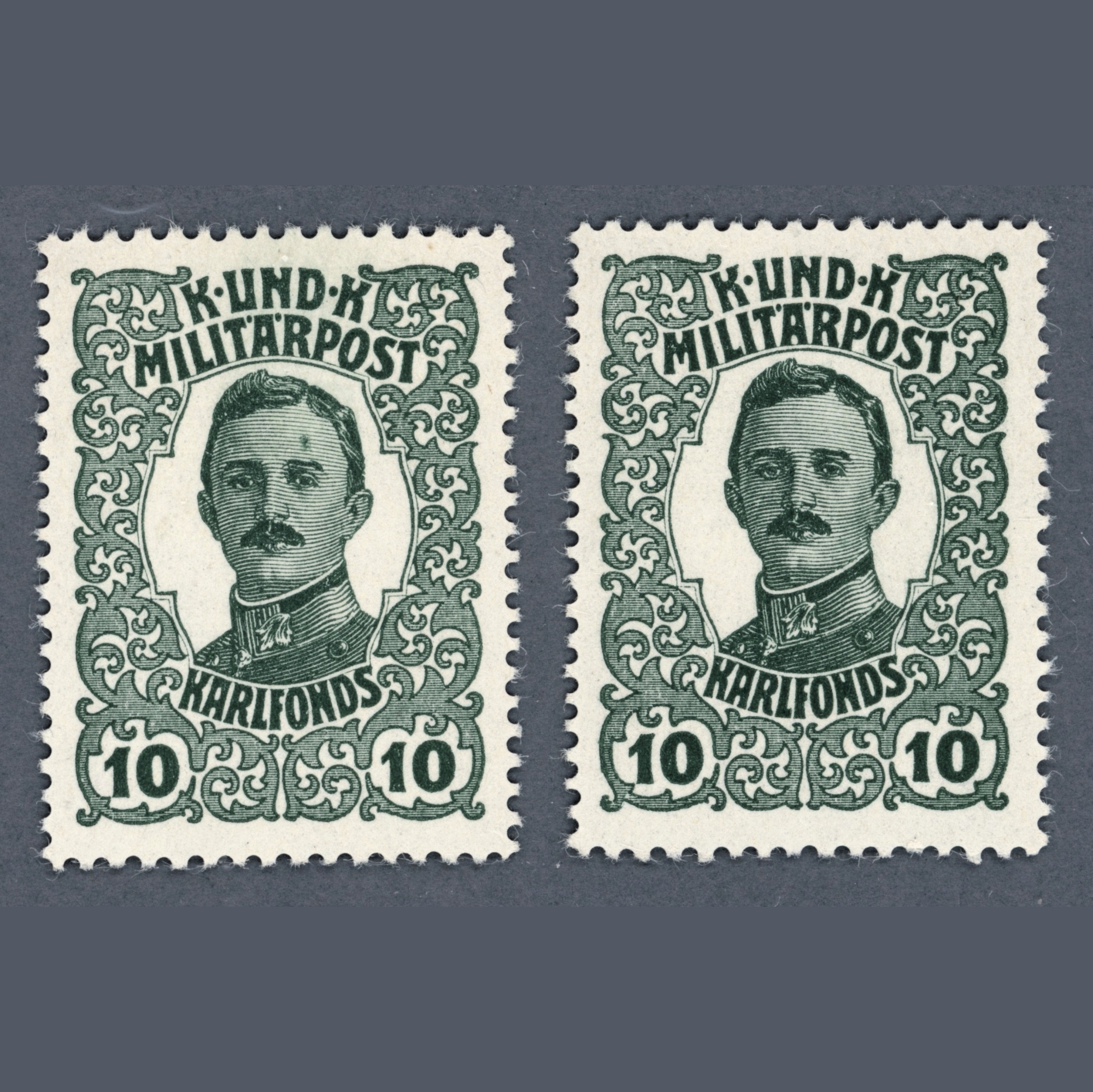 1918 Austria - K.u.K. Militarpost - Charles IV. mint hinged * 10 heller stamp with spot on the forehead misprint + reference item