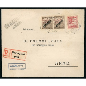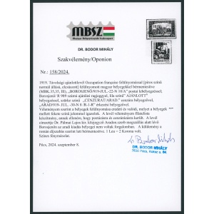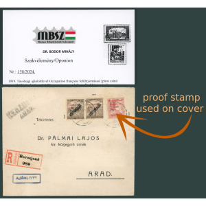 1919 Arad – Censored, tariffically correct envelope sent from Ineu to Arad with a proof stamp (PHu III.), which officially not used in postal circulation | Attested by Bodor