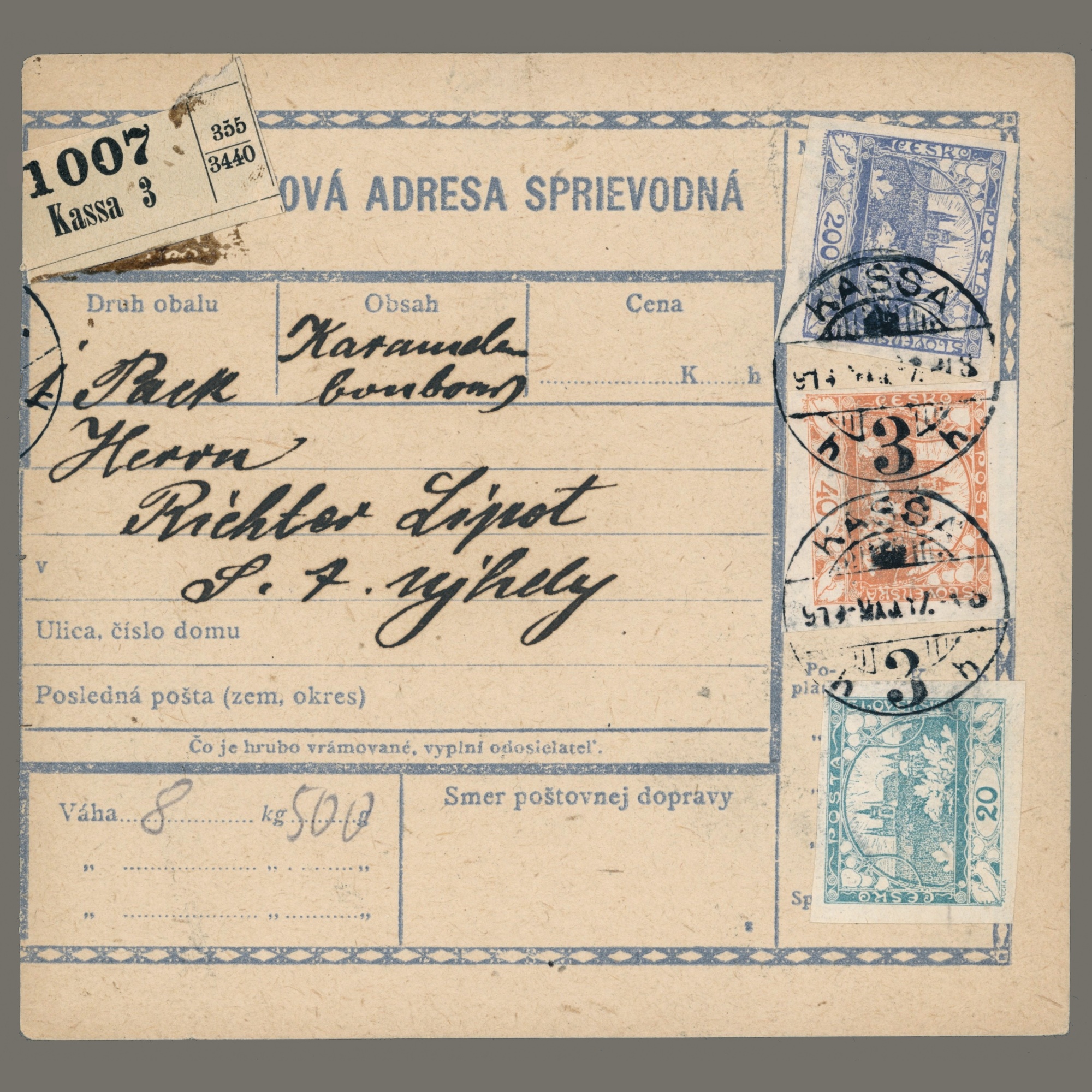 1919 Czechoslovakia – Parcel card posted in Kassa, sent to the occupied Sátoraljaújhely, on the 18th-19th day of the 36-day occupation of Sátoraljaújhely, postage due collected with Czechoslovak stamp in Sátoraljaújhely
