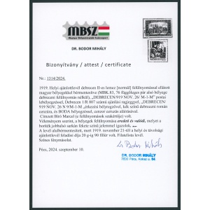 1919 Debrecen – local registered letter from the correspondence of Marcell Bíró – the Romanian overprint missing from one of the Republic / Charles 25 f stamps – the misprint is very rearly seen on cover | Attested by Bodor