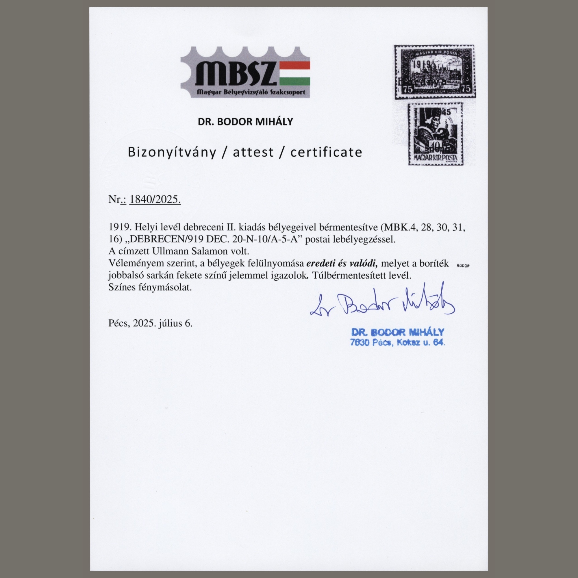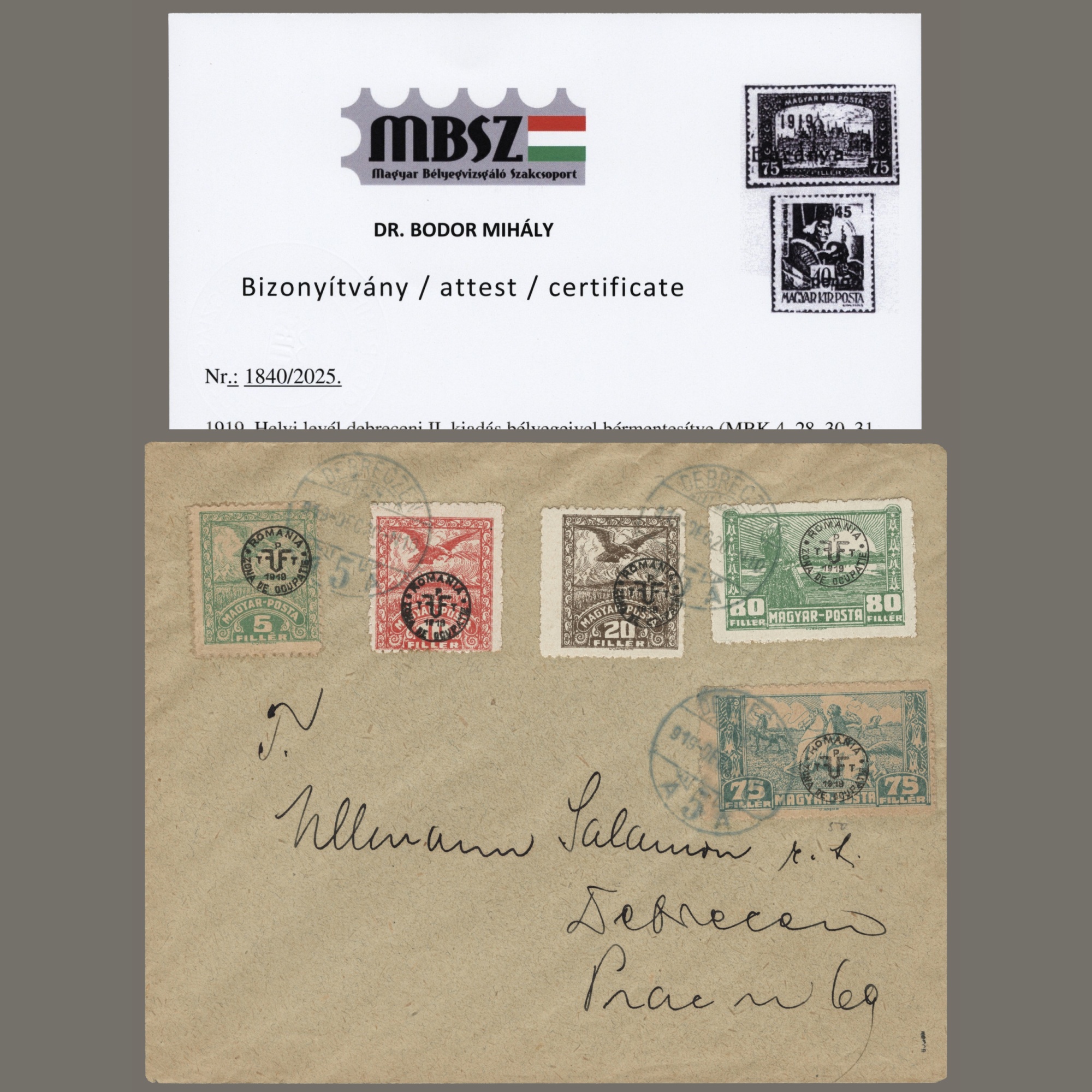 1919 Hungary – Debrecen local letter with Romanian overprinted stamps of the 2nd issue #2 – Attest Bodor