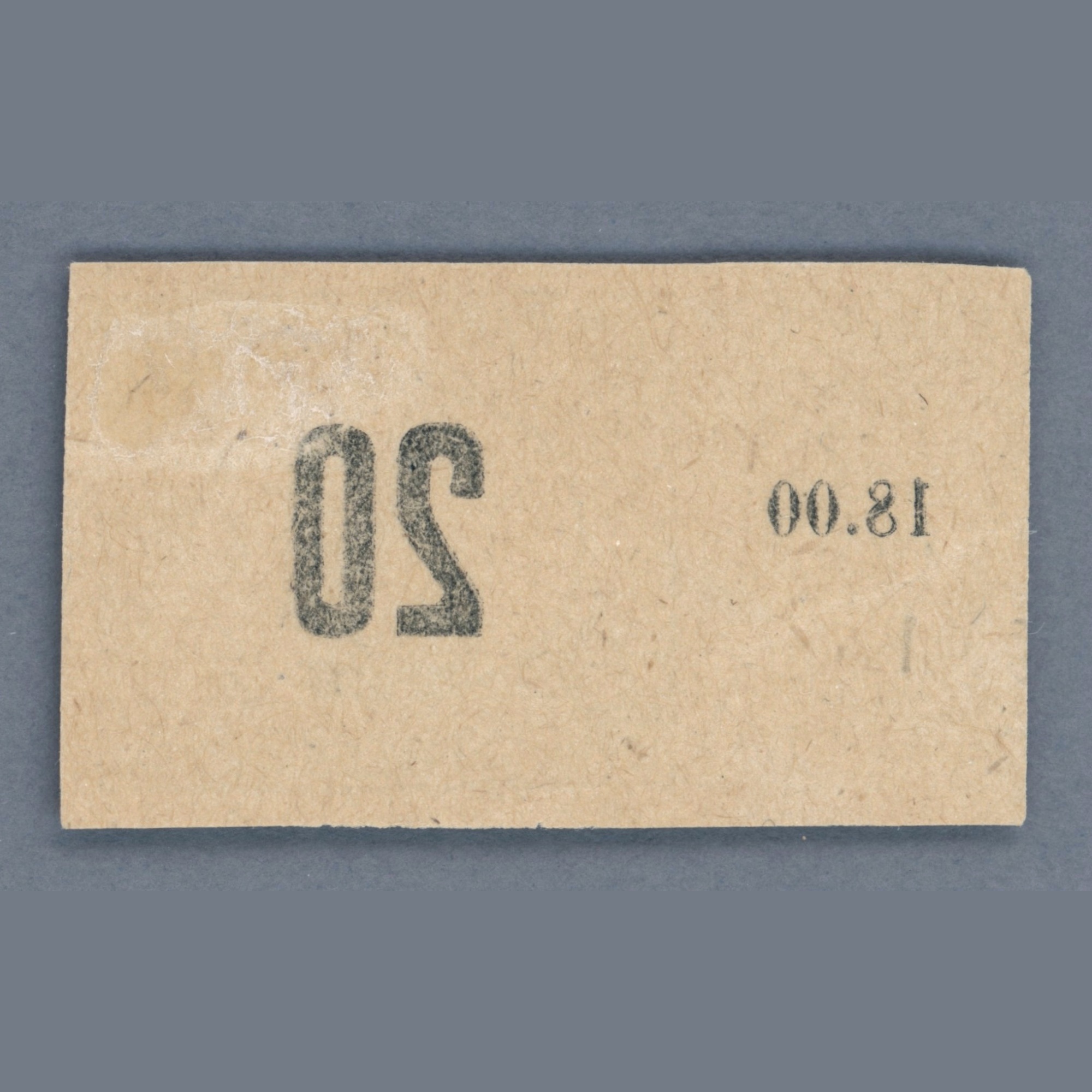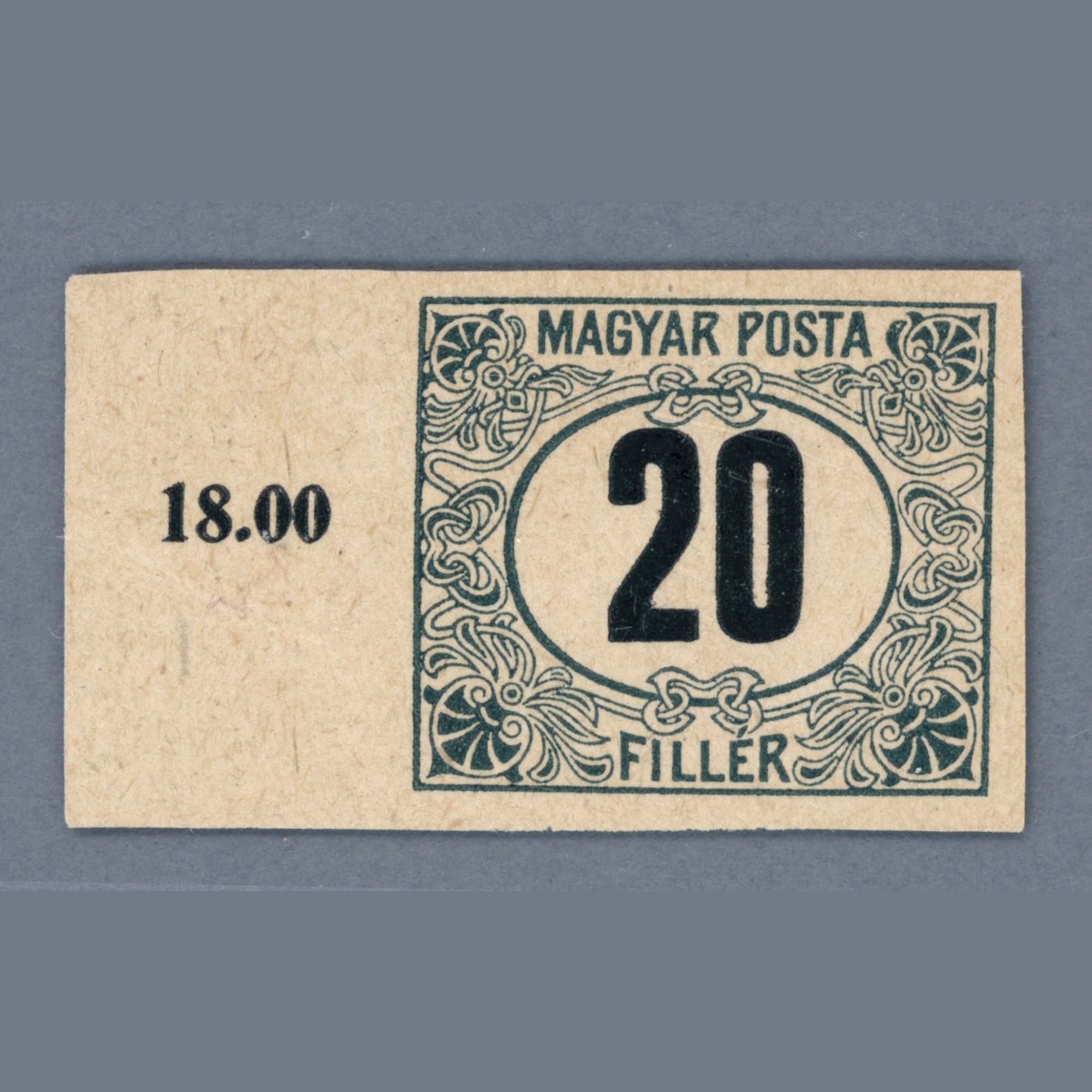1919 Hungary – Magyar Posta 20 f proof, with the double impression of the denomination and with machine offset on the verso