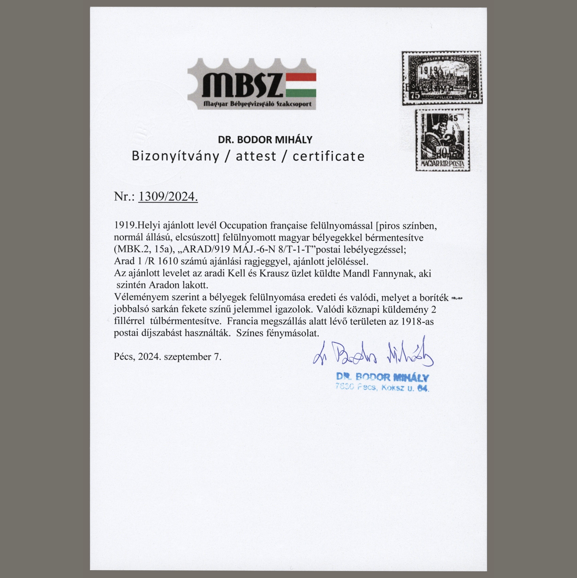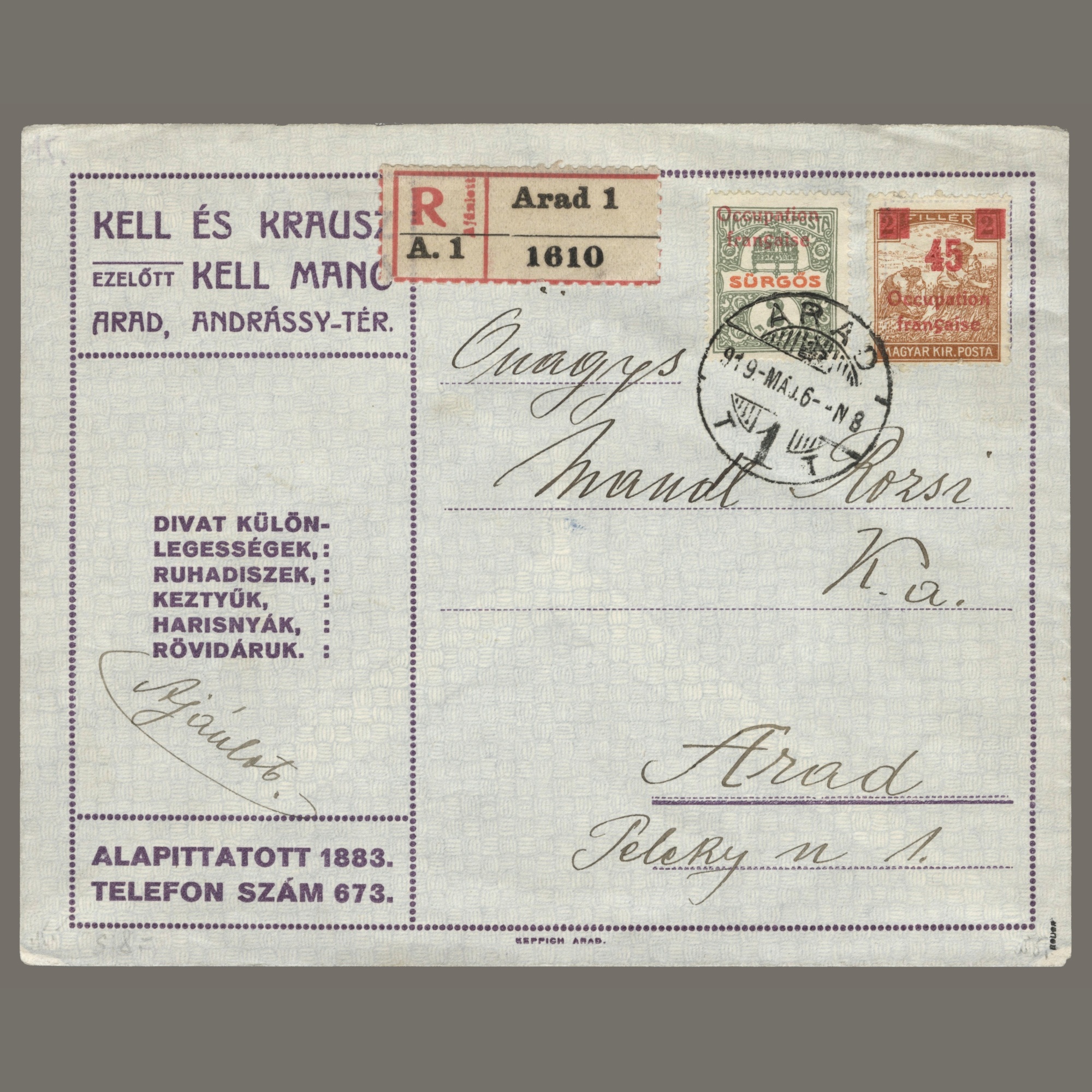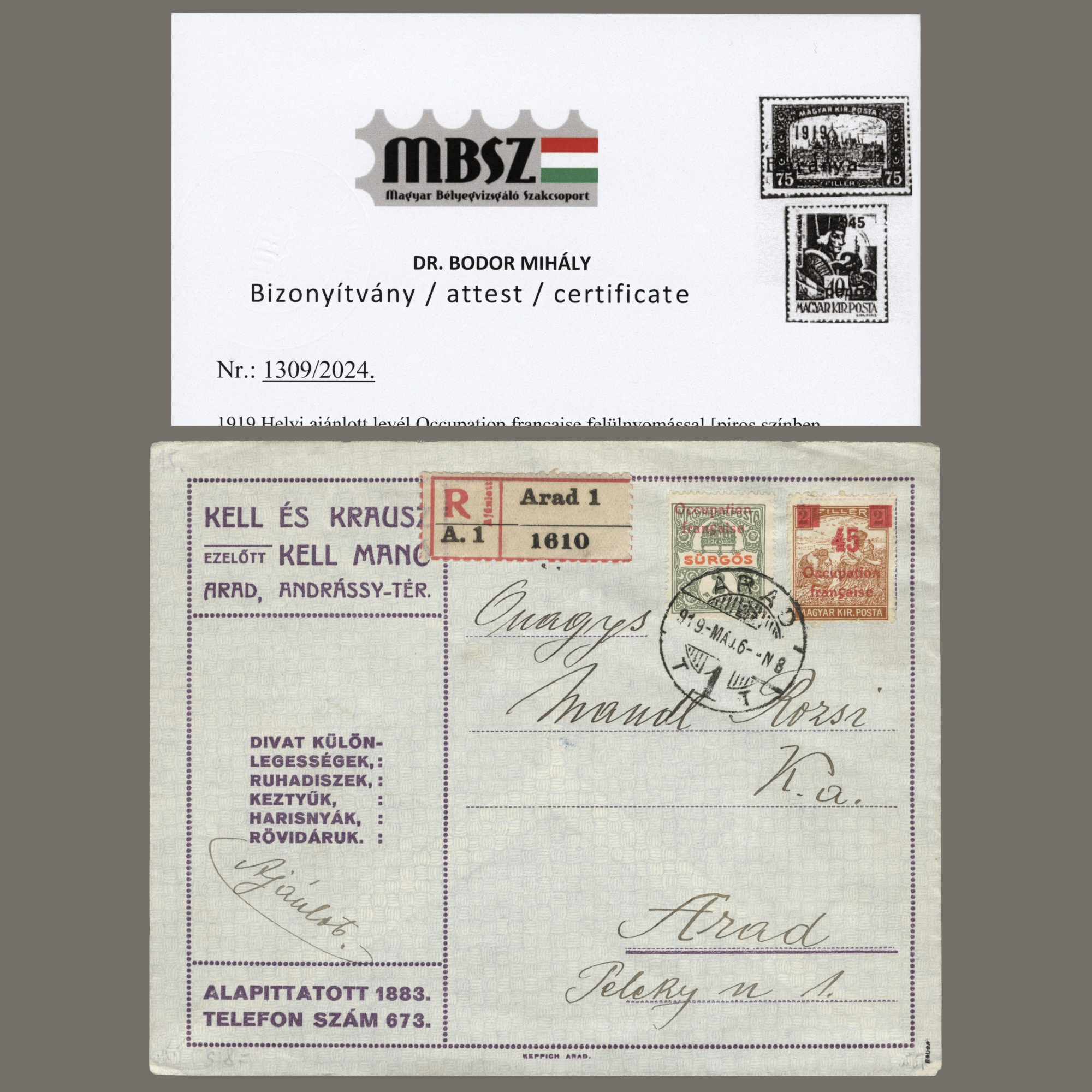 1919 Romania – Arad local registered company cover with overprinted stamps of the French occupation. Upwards slipped overprint on the sürgős (urgent) stamp. – Attest Bodor