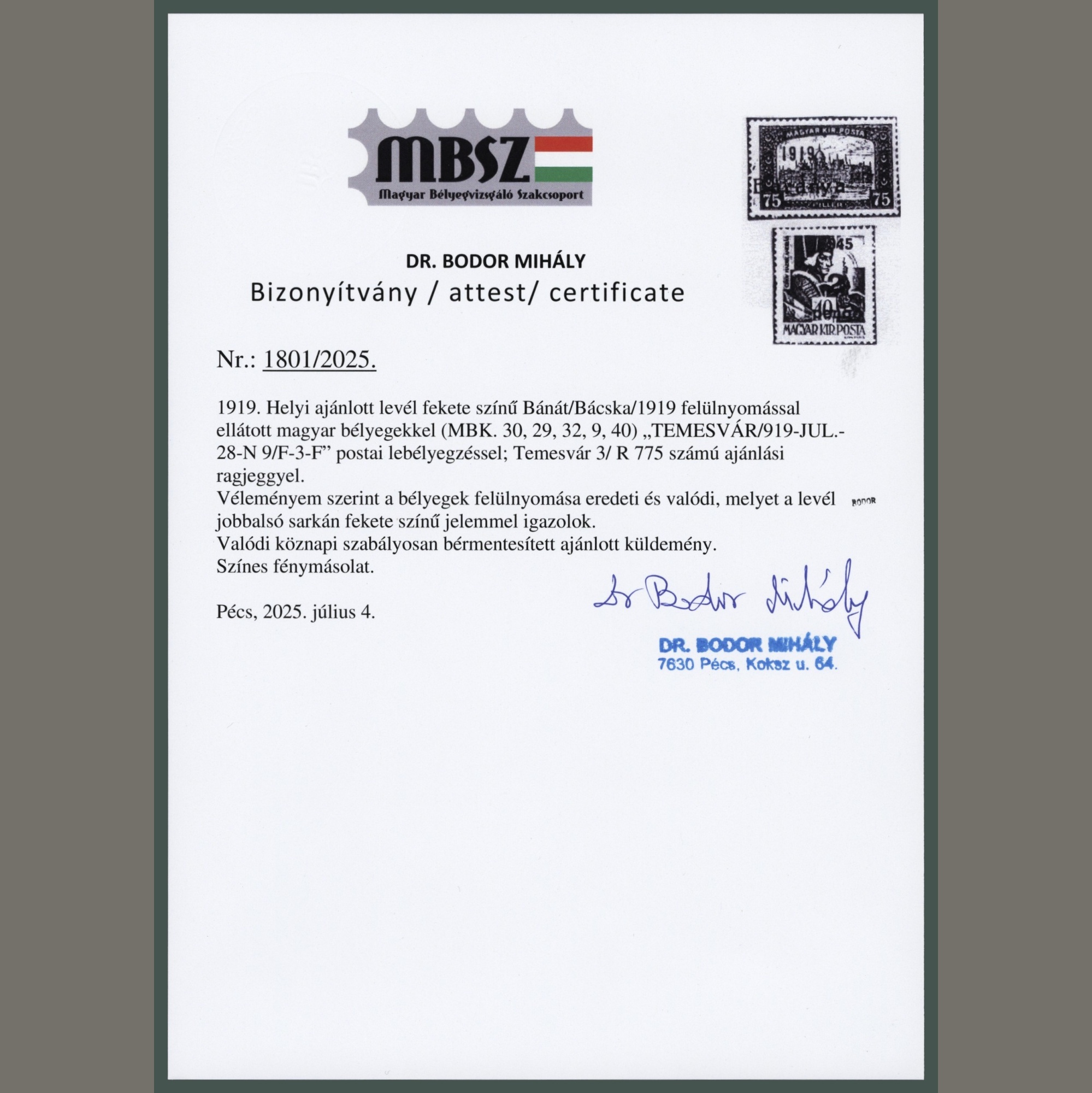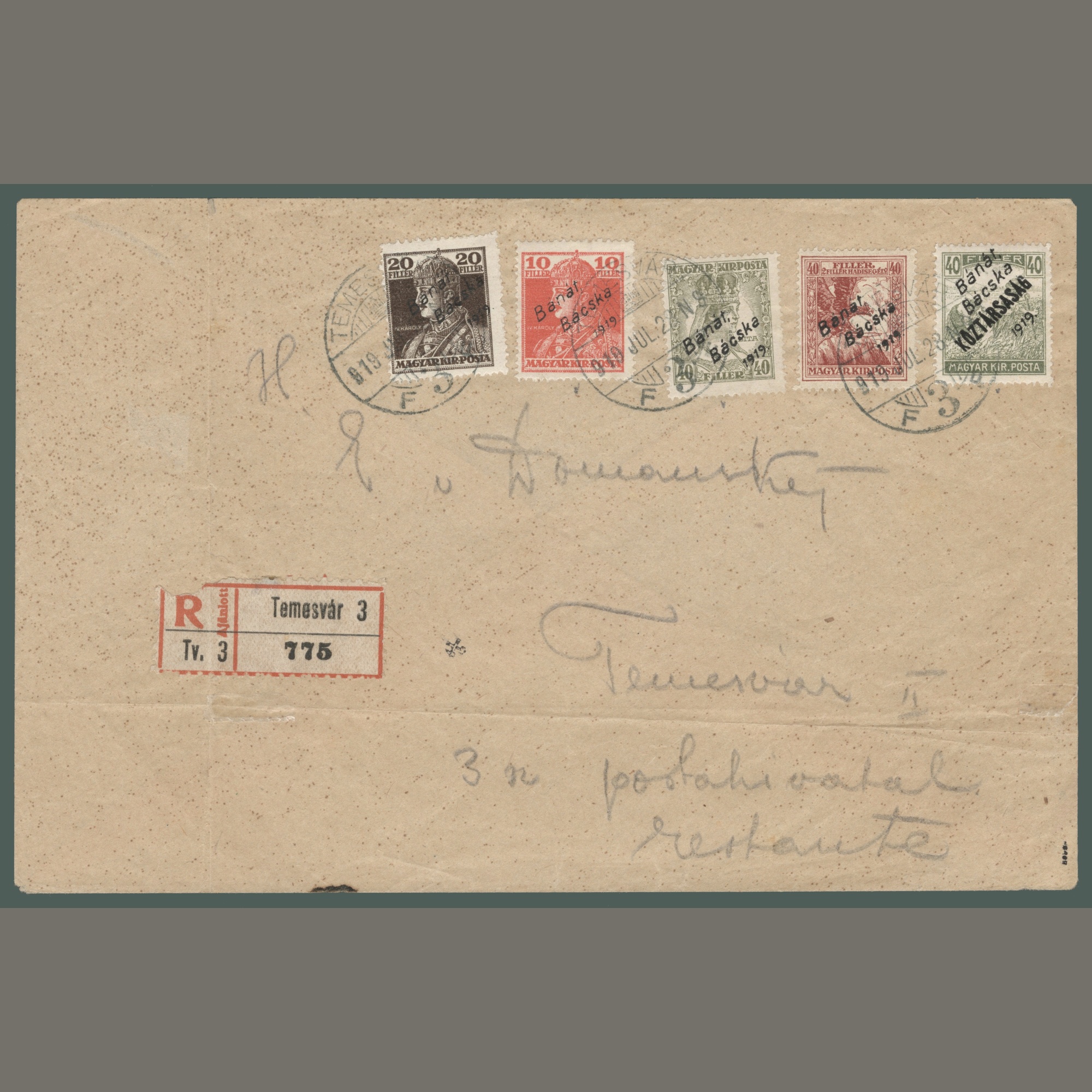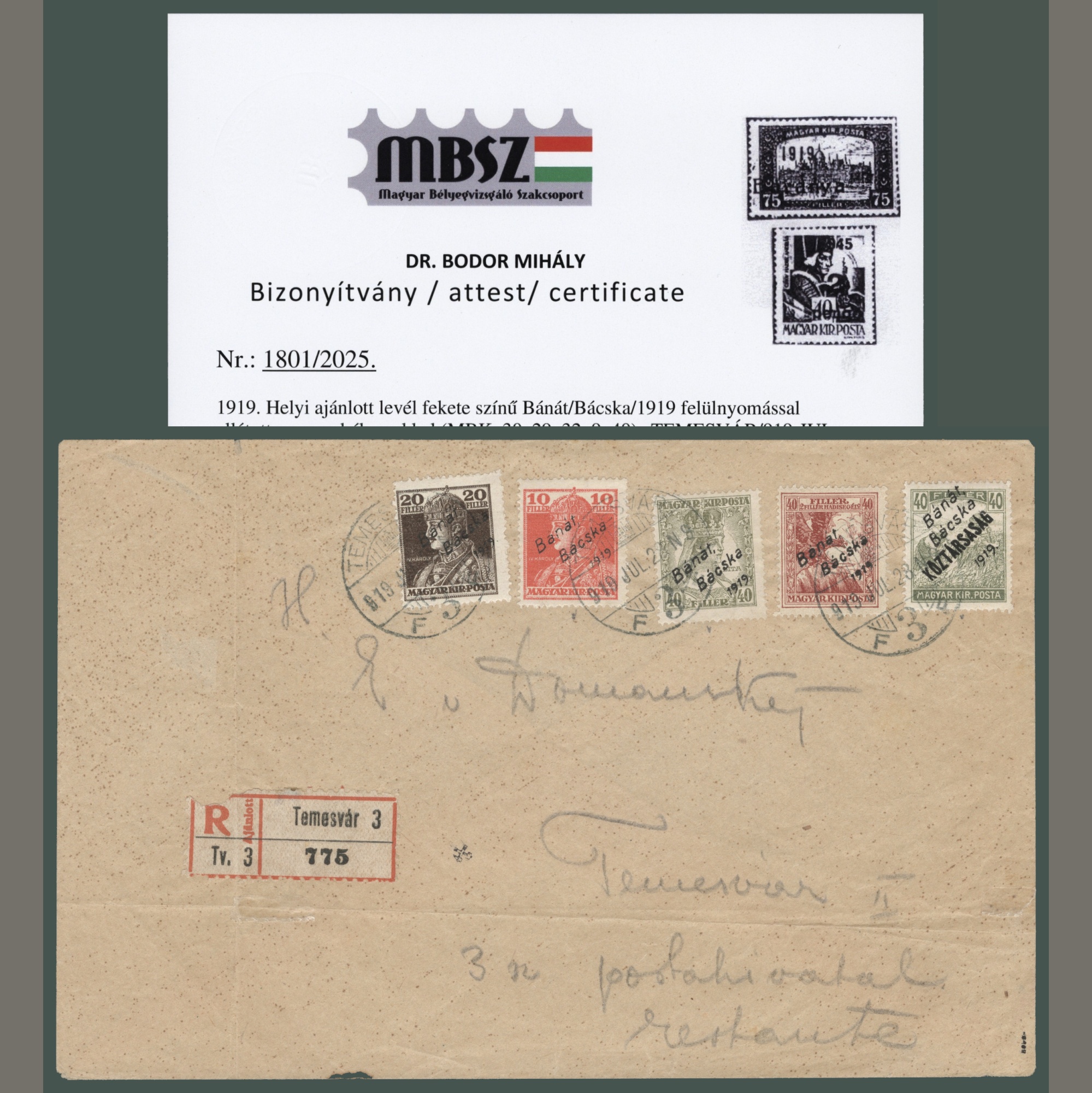 1919 Romania – Bánat-Bácska – Timisoara local registered cover with Bánat-Bácska overprinted stamps – Attest: Bodor