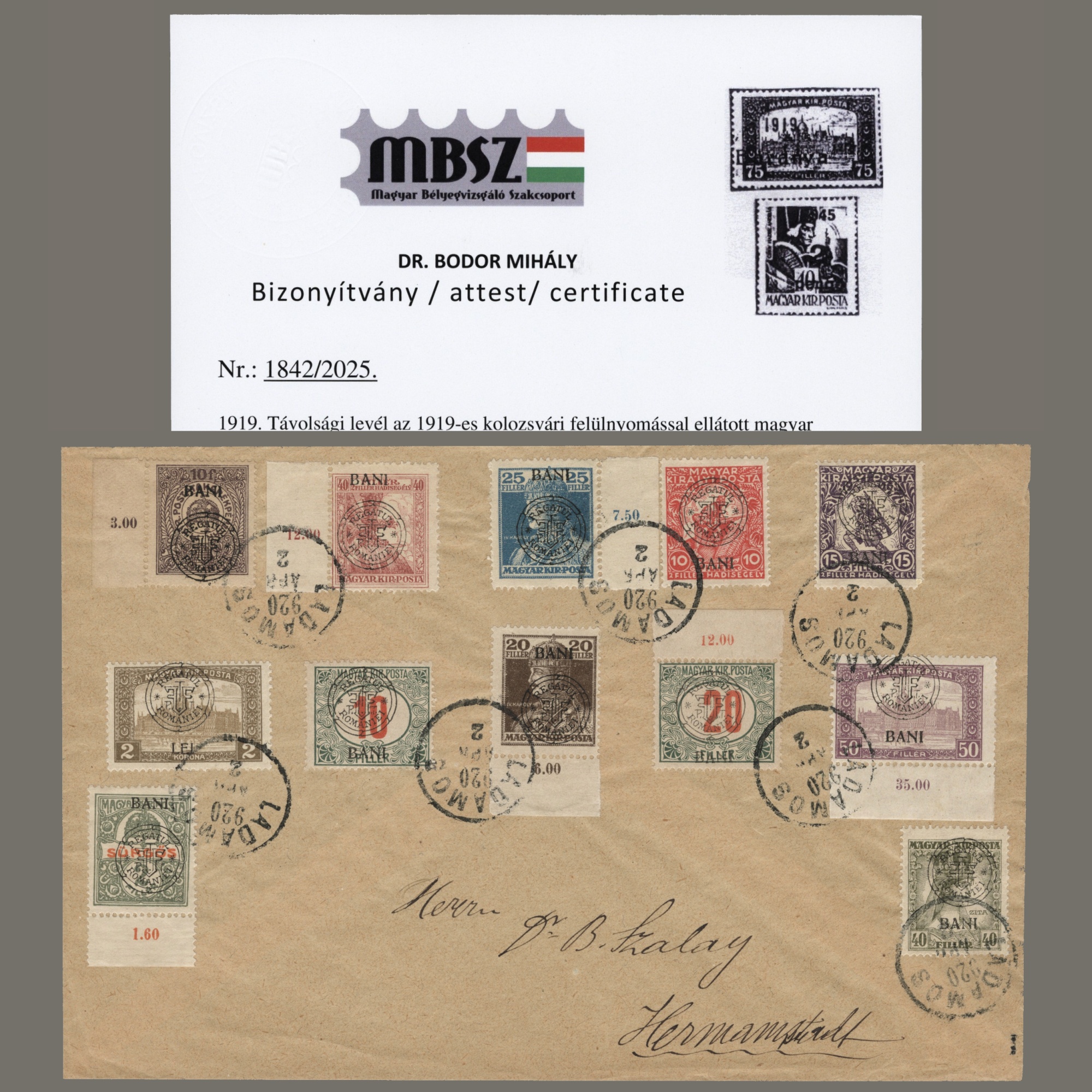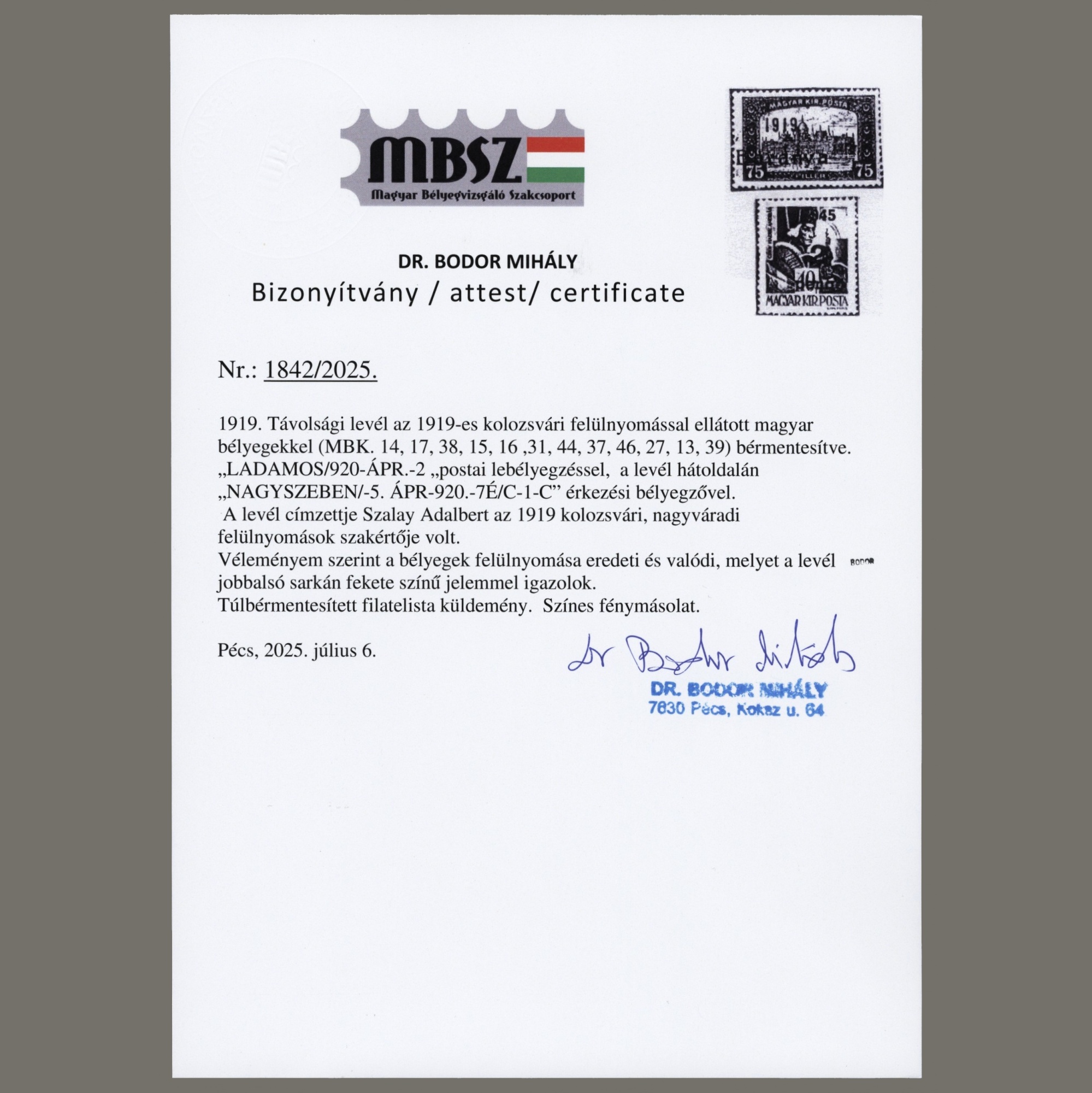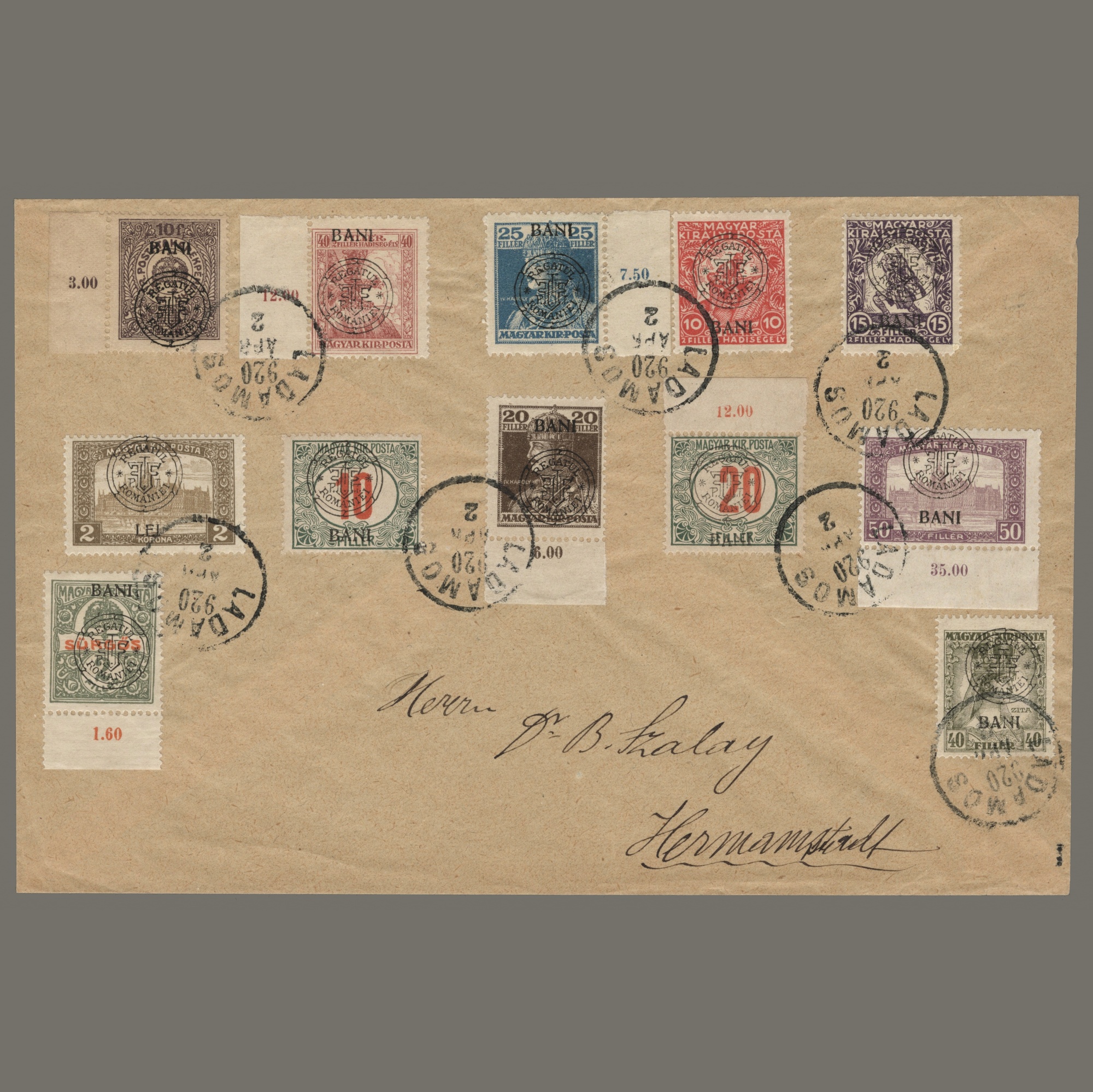 1919 Romania – Kolozsvár – Cover from Ladamos to Sibiu with Kolozsvár overprinted stamps – addressee is the stamp expert Adalbert Szalay