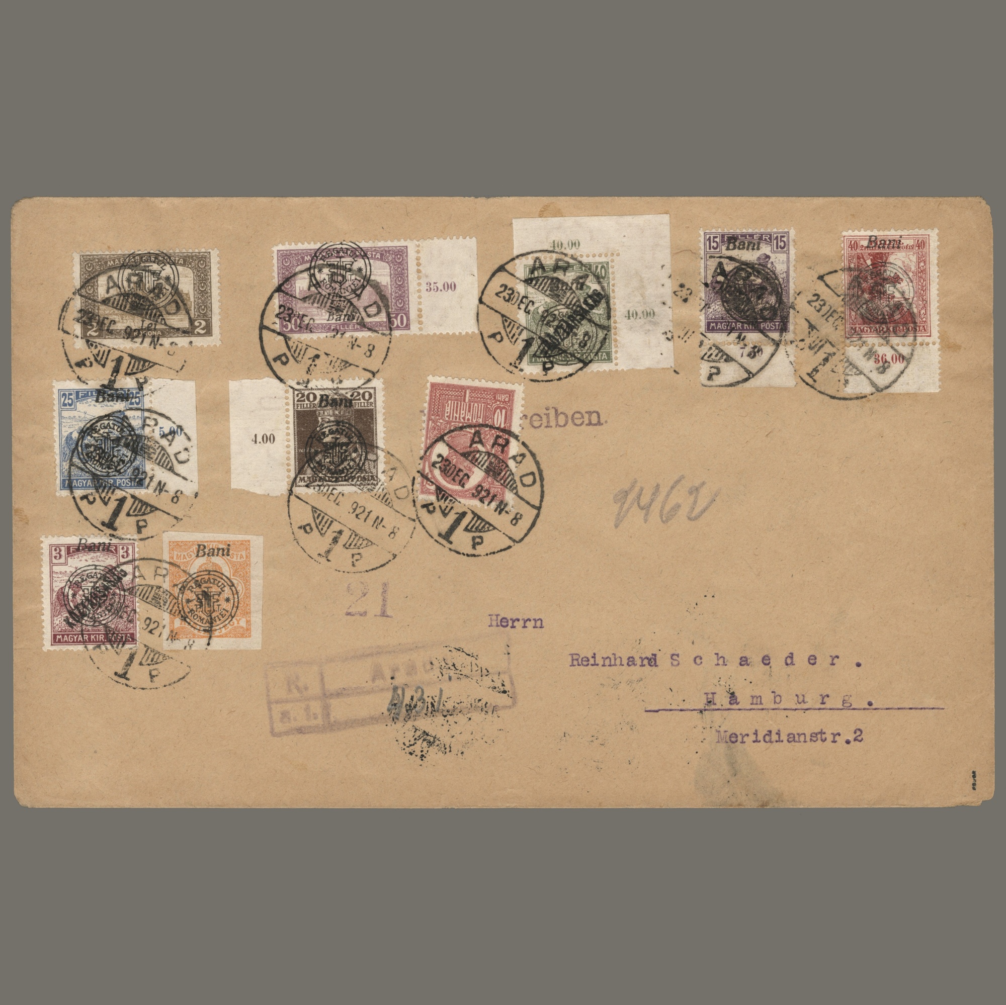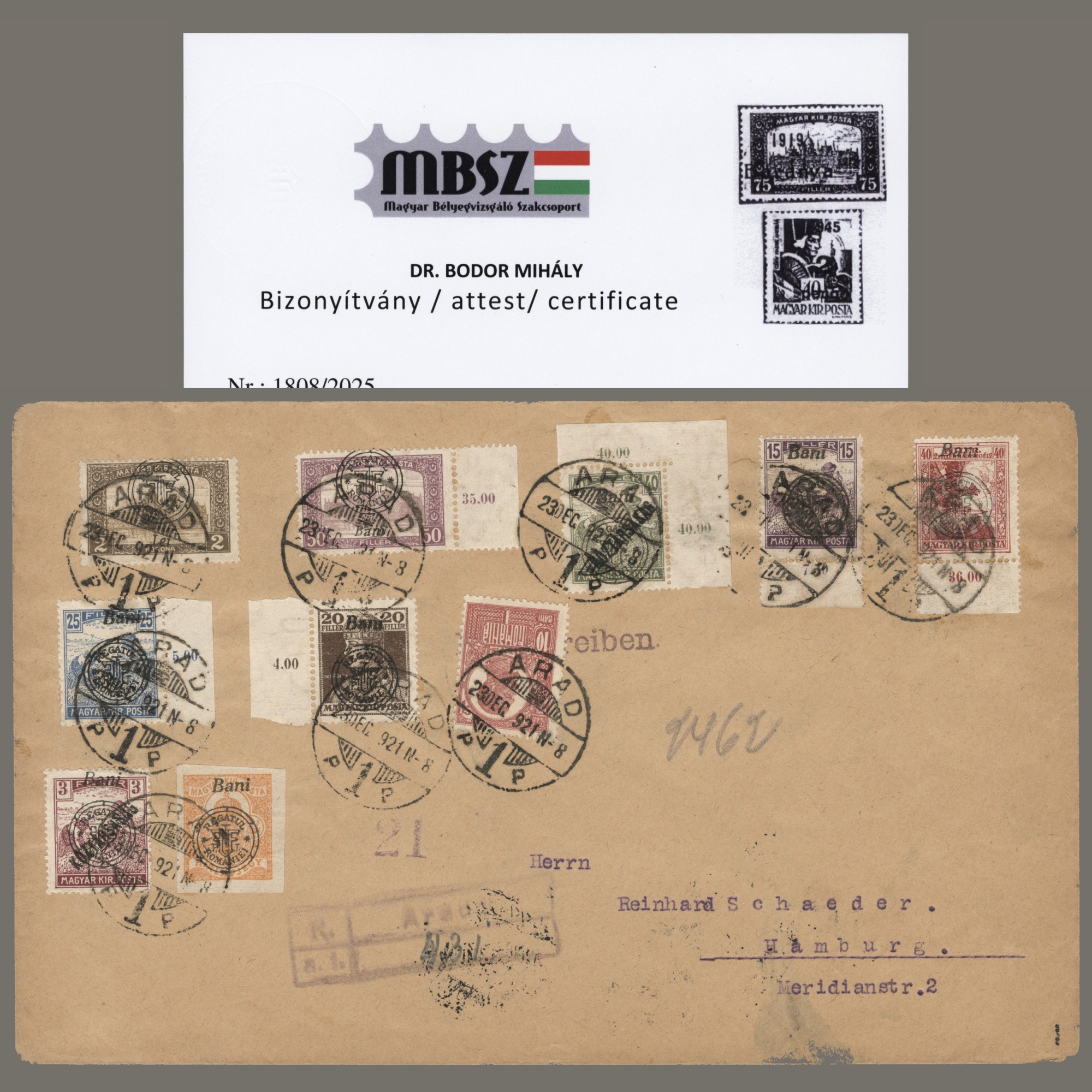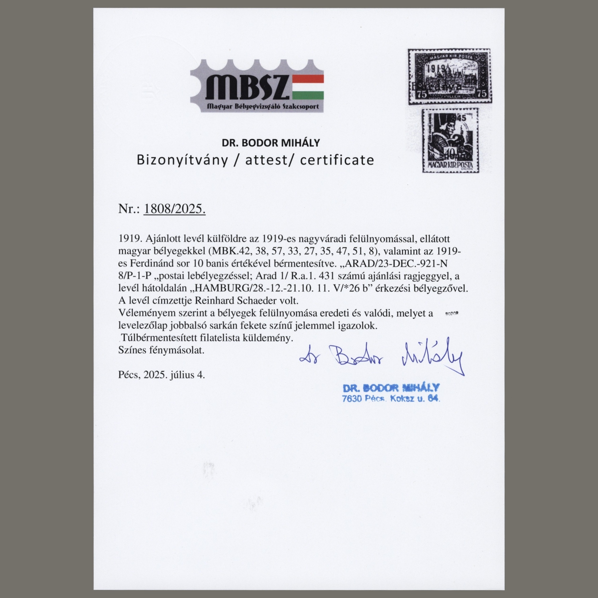 1919 Romania – Nagyvárad – Registered letter sent from Arad to Germany with “Nagyvárad” overprinted stamps – Attested by Bodor