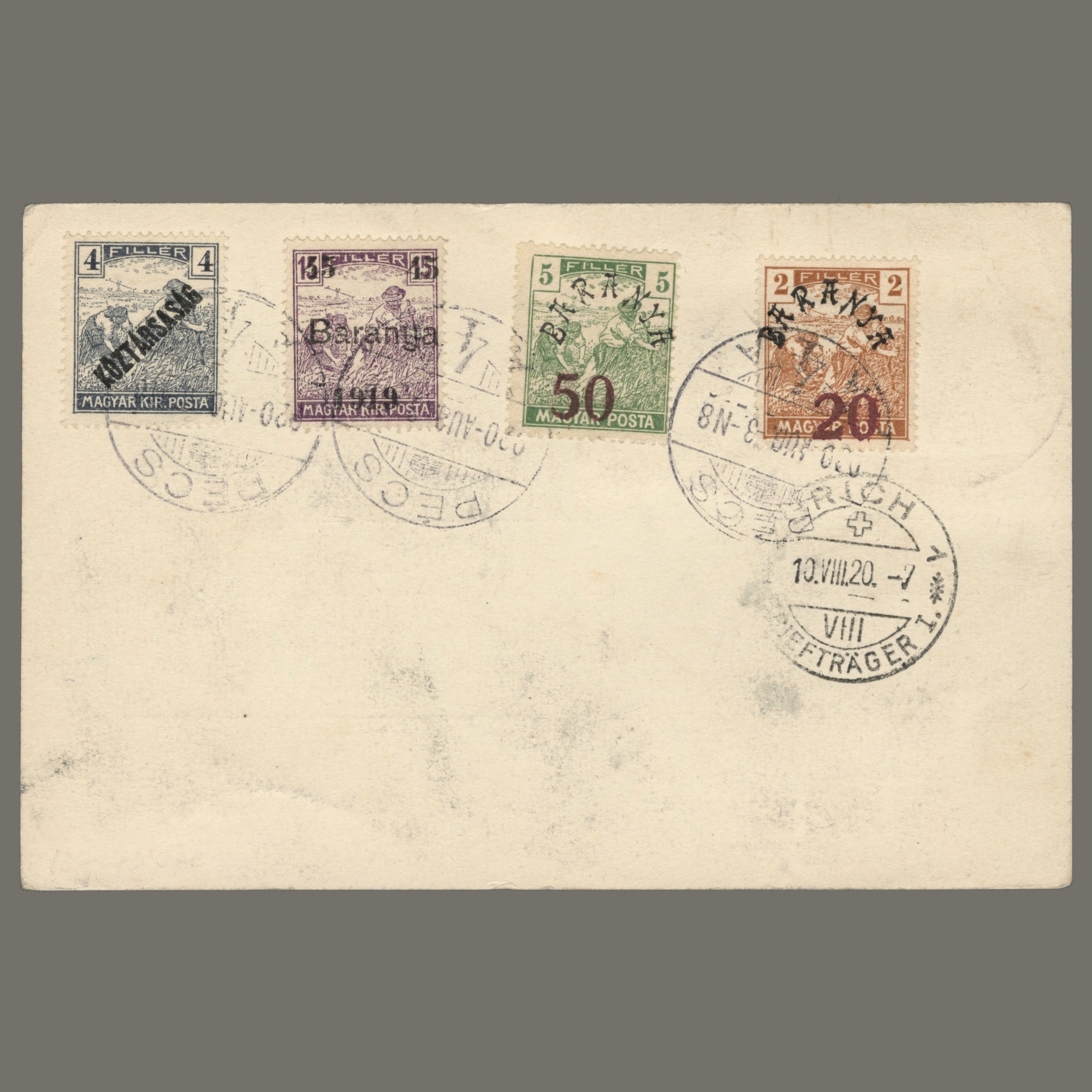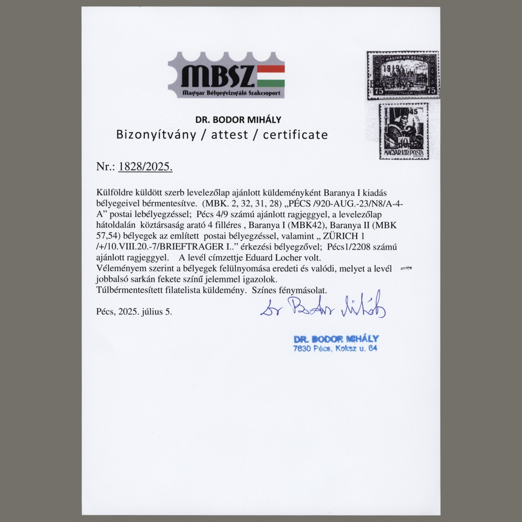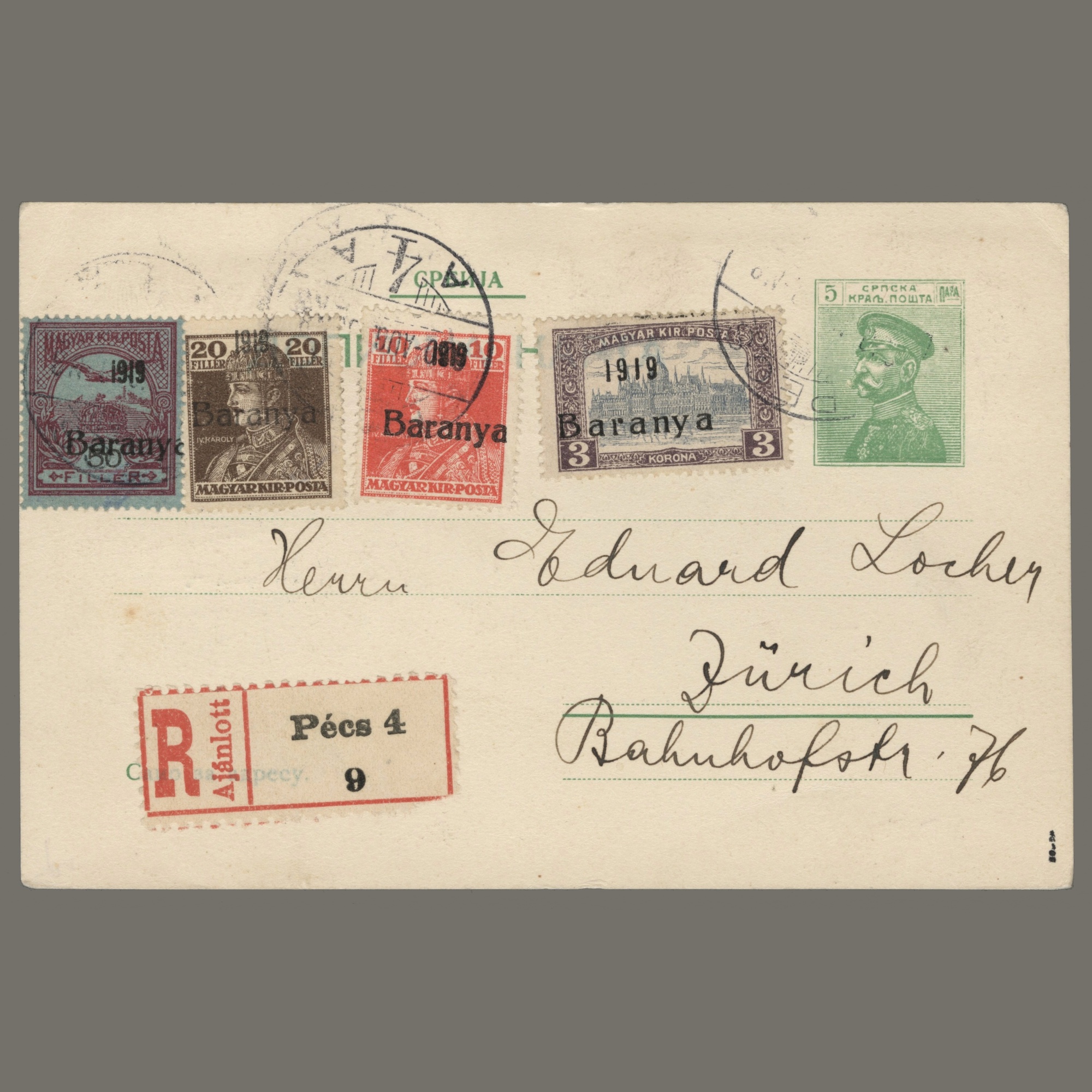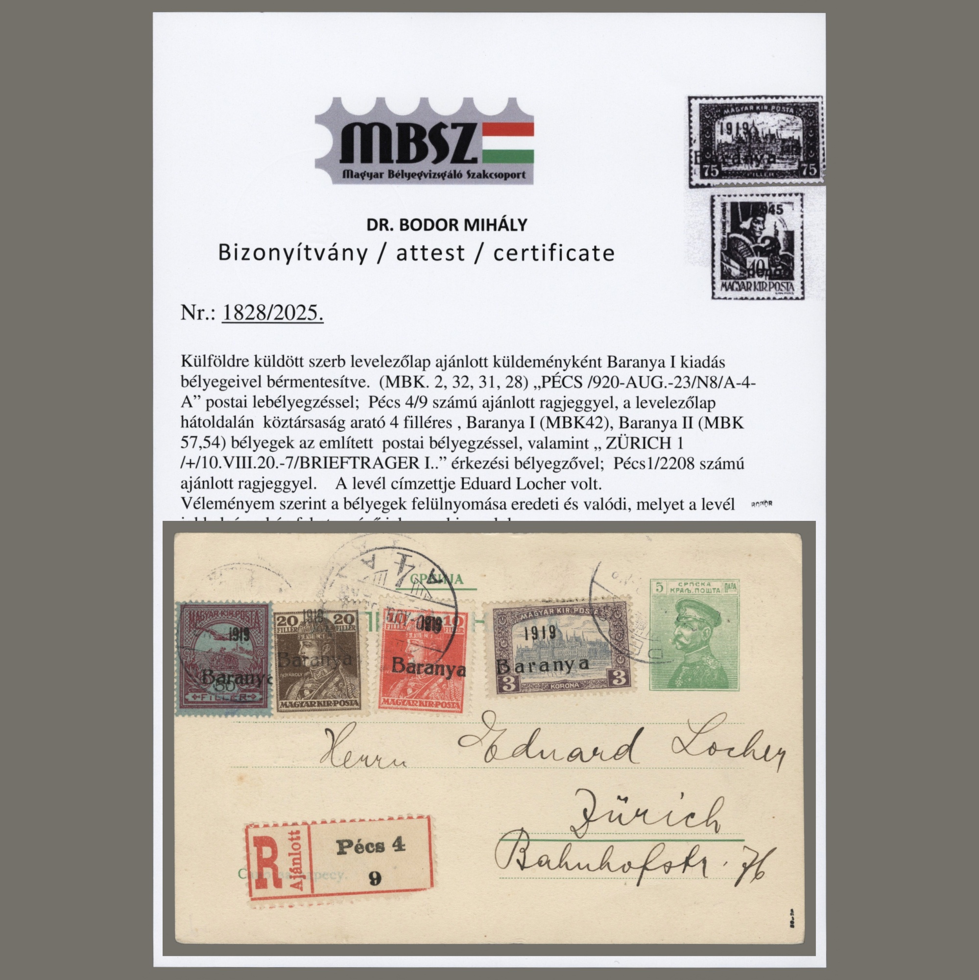 1920 Hungary – Baranya – Registered postcard sent from Pécs to Switzerland. A Serbian postal stationery was used for the posrcard, with overprinted stamps of KÖZTÁRSASÁG and Baranya I. as mixed franking. Attested by Bodor