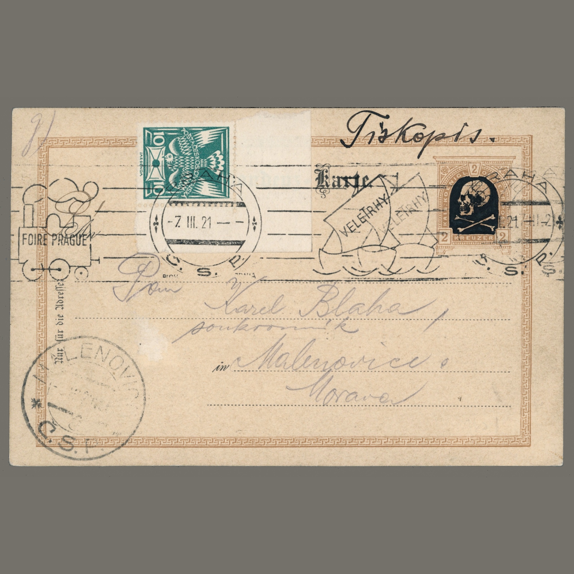1921 Czechoslovakia – Austrian postal stationery of 1890, redrawn with an anti-monarchy ink drawing, with a skull in place of the monarch’s head.