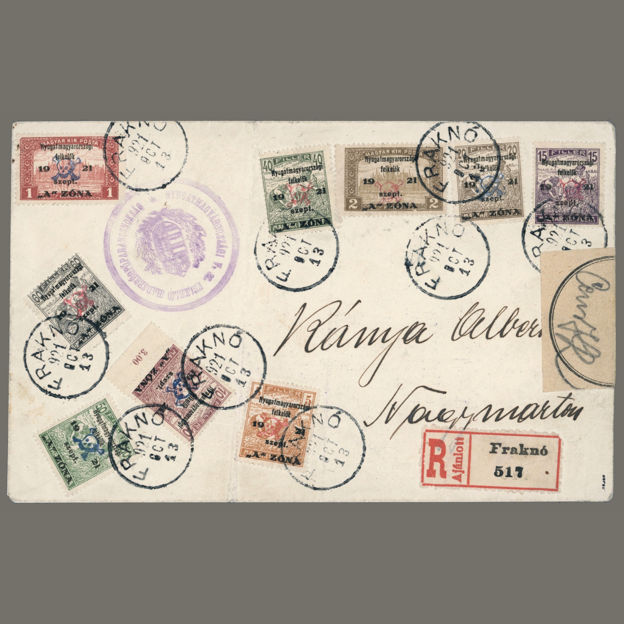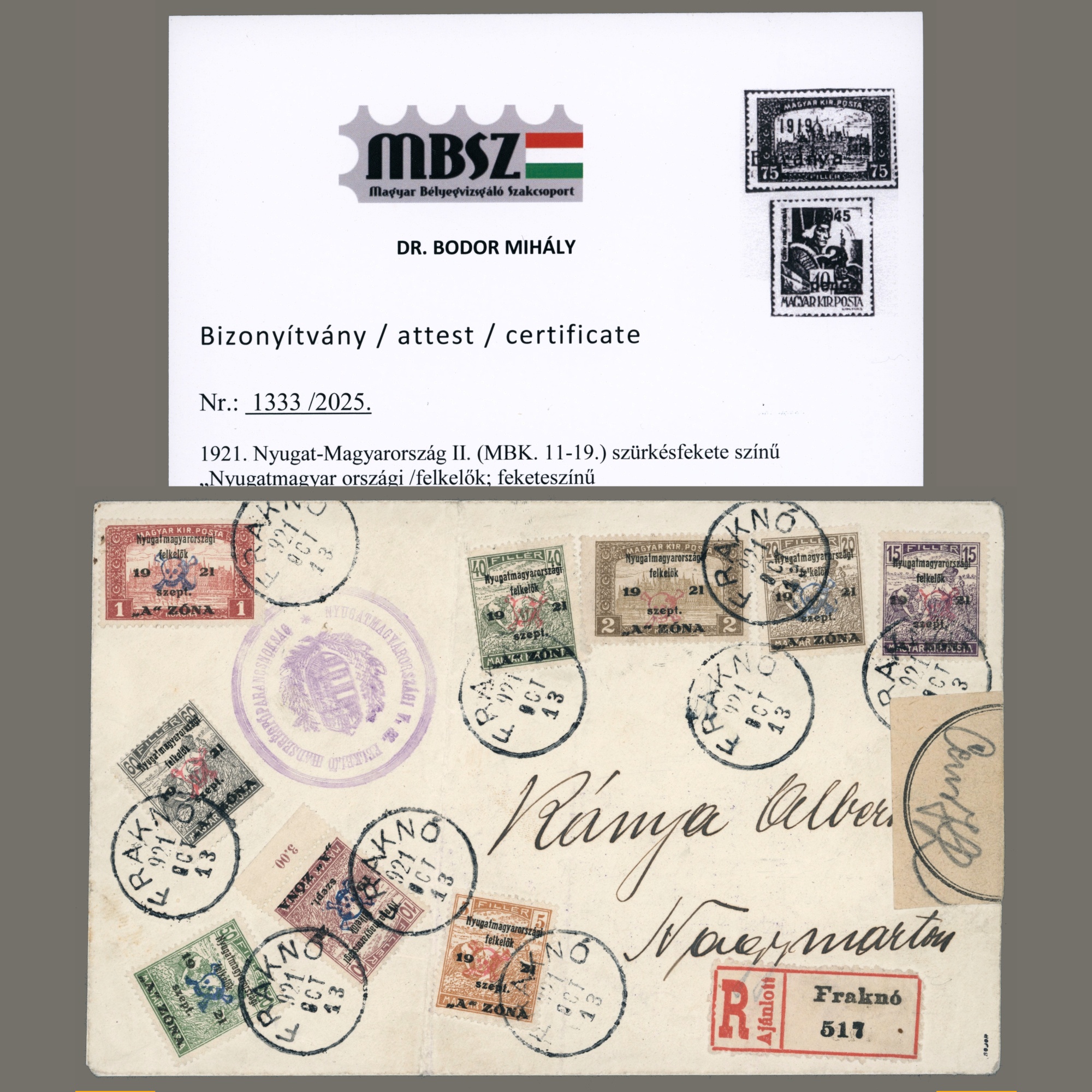 1921 Hungary – Western-Hungary II. complete set on a censored registered envelope – sign Mertl – Attest Bodor