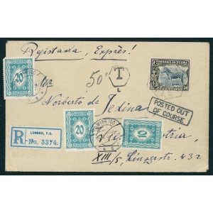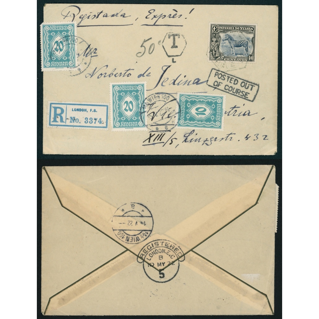 1922 Companhia do Niassa – envelope sent to Vienna posted in the port. With London registered label, postage due collected in Vienna.