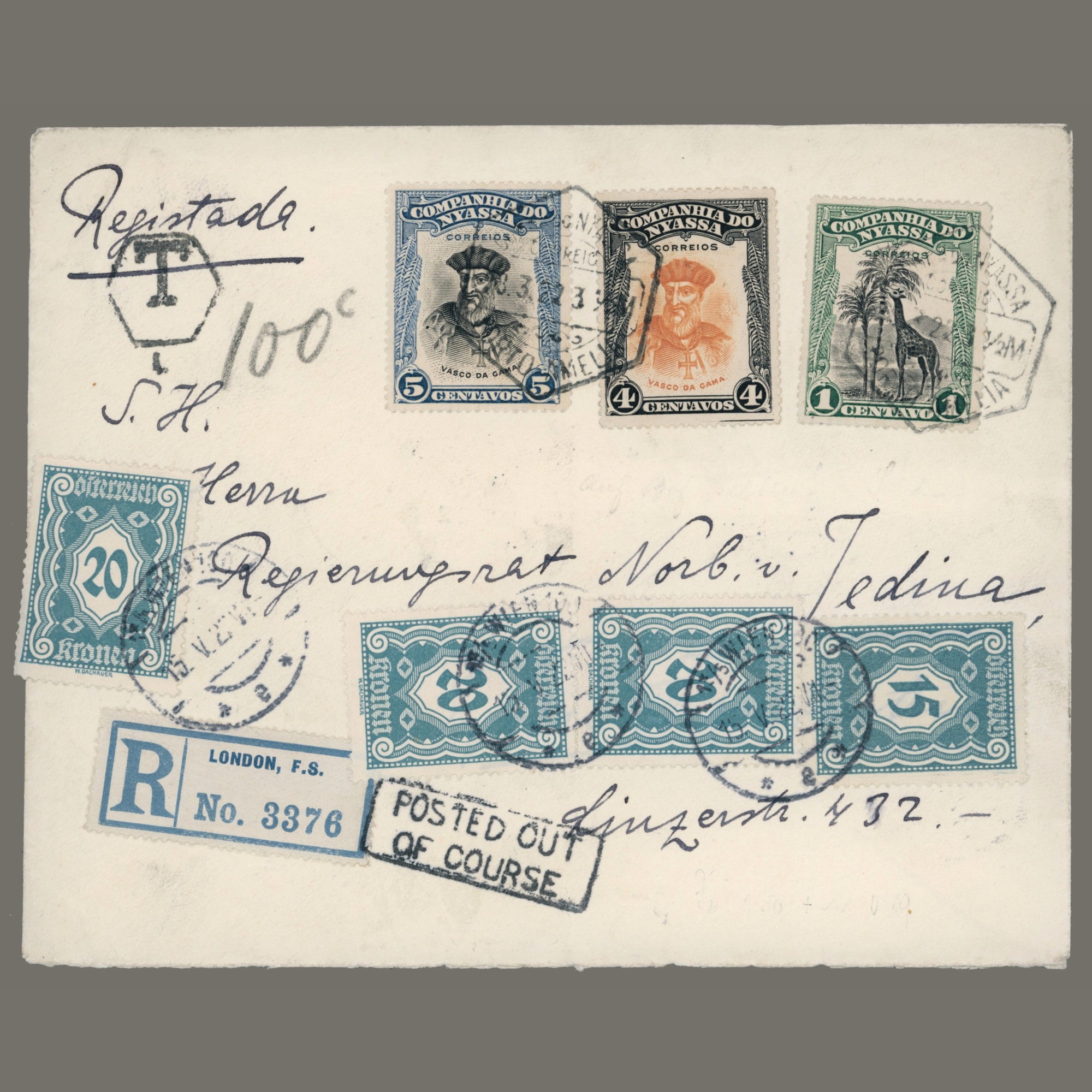 1922 Nyassa – A cover sent from the Portuguese colony to Vienna, posted at the port, so the registered label was only affixed in London. Postage due (75 kronen) collected in Vienna.
