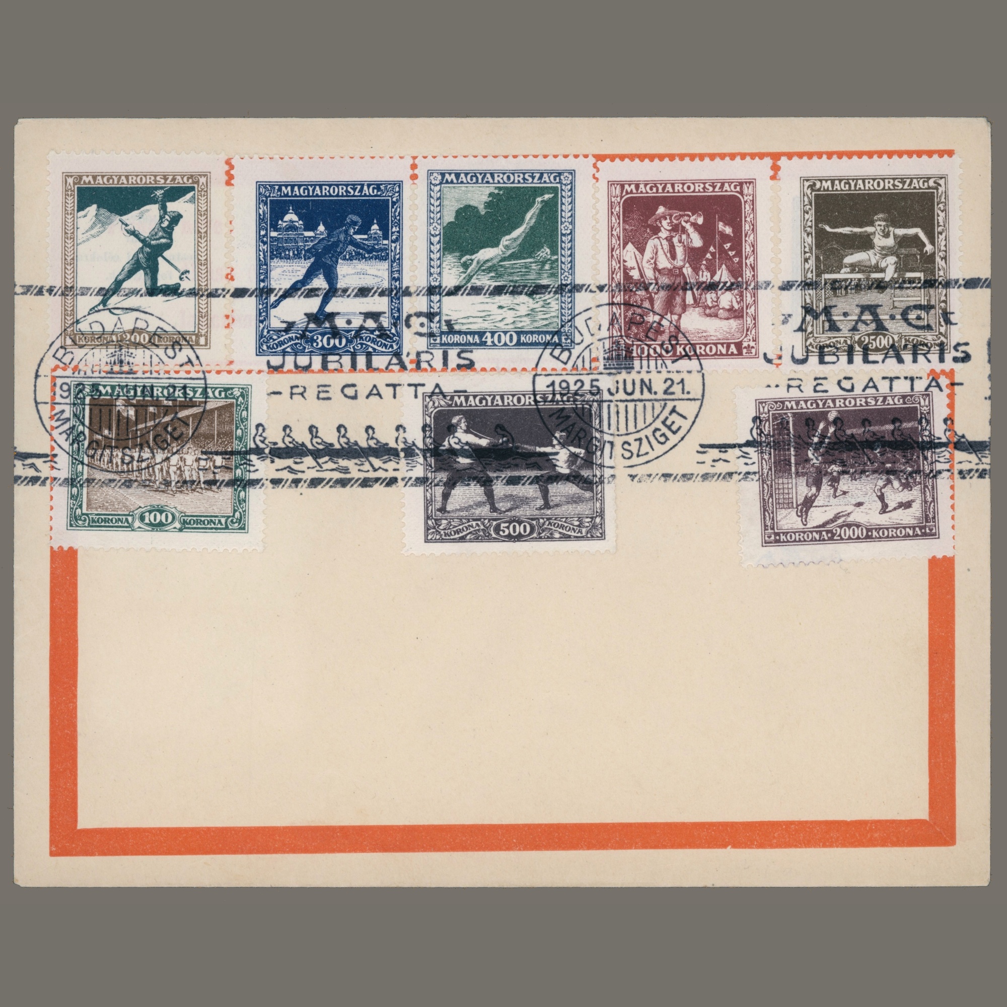 1925 Hungary – Sport set on a 35 filler postal stationery envelope with ‘Jubilás Regatta Margitsziget’ occasional postmark