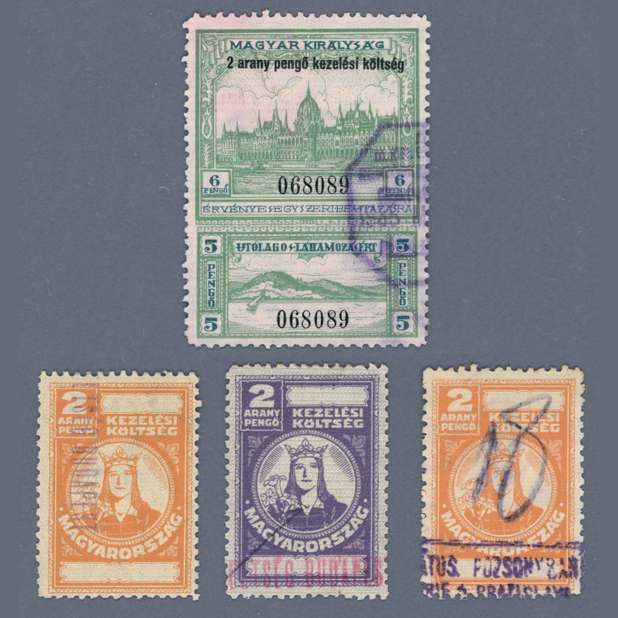 • 1870 Hungary – 5 kr revenue stamp on superthin paper with the double print of the base print