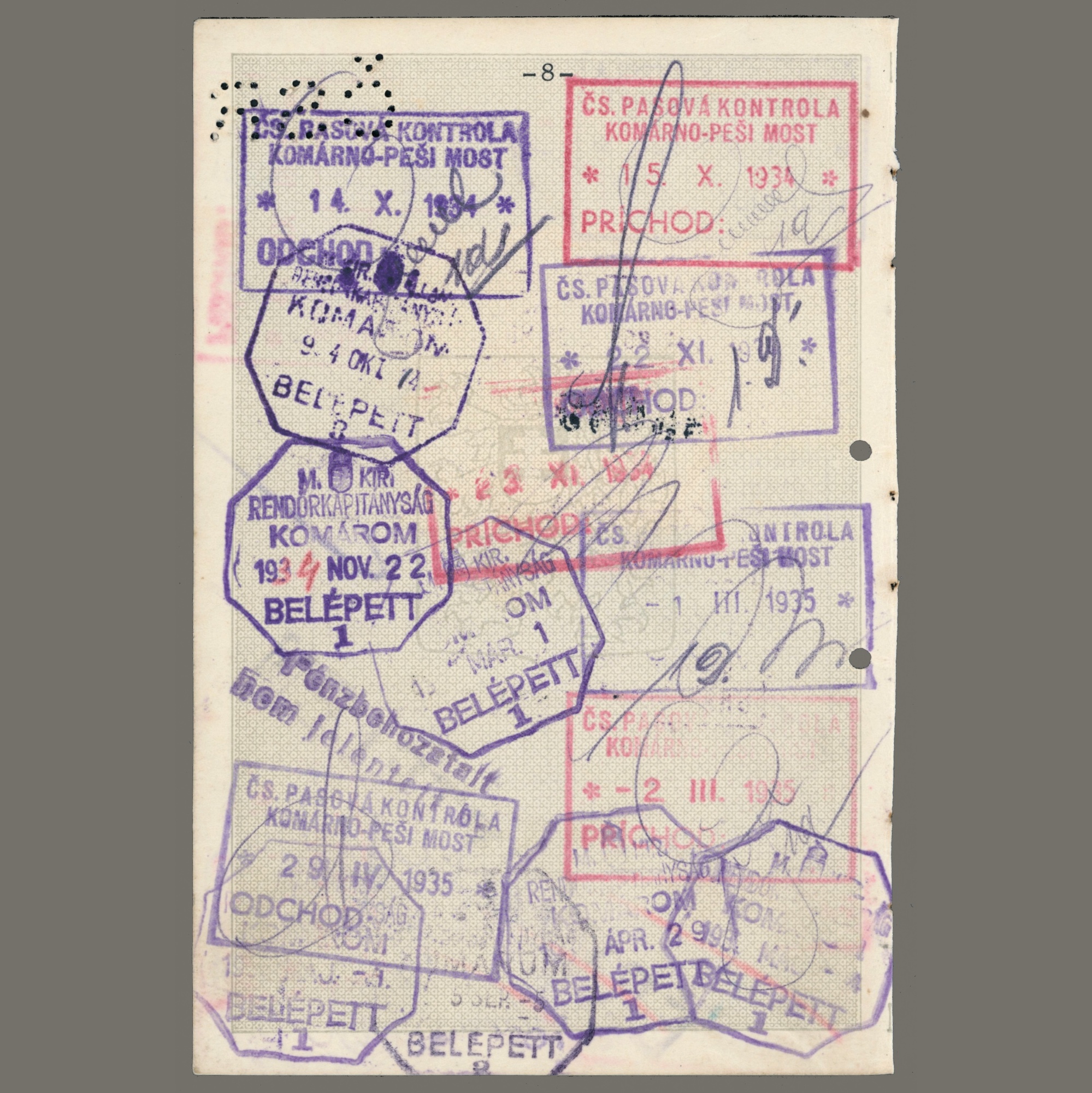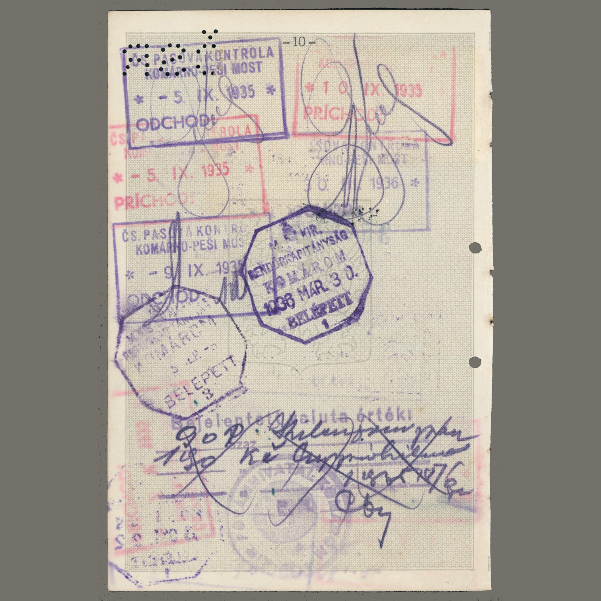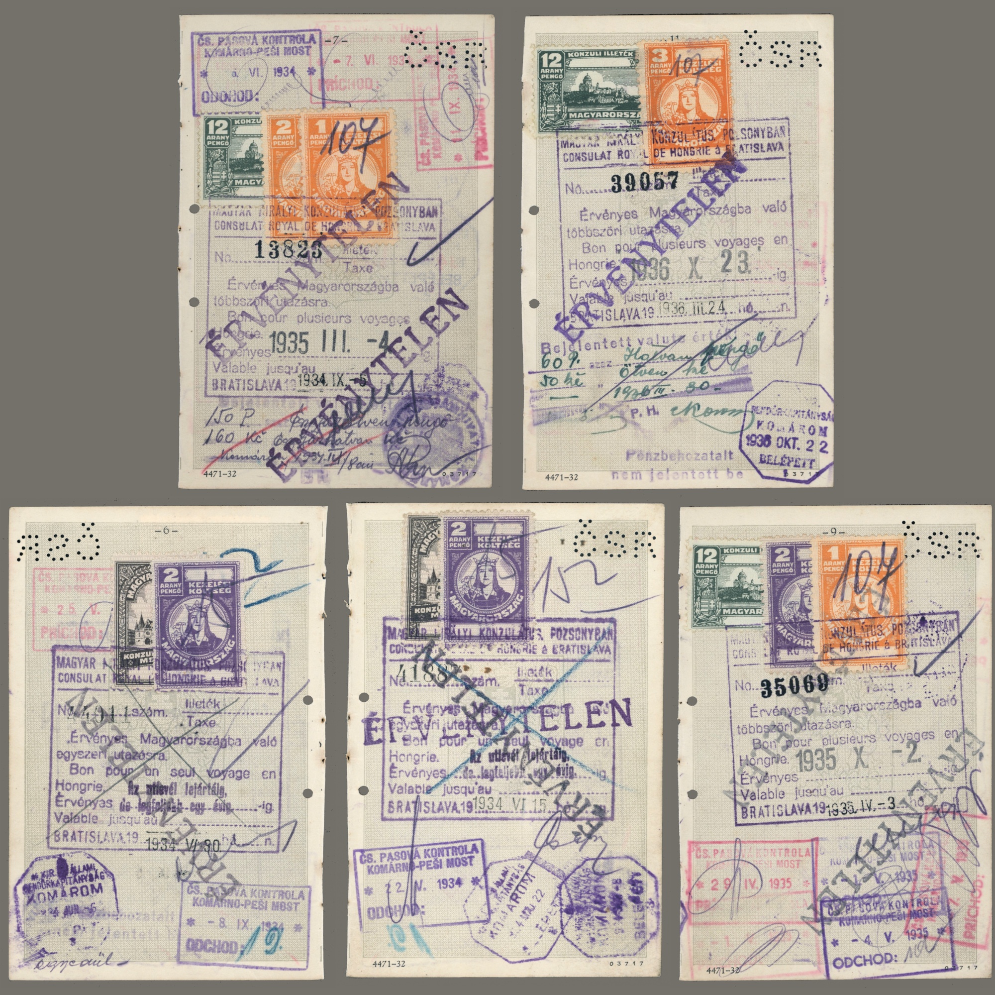 1935 Hungary – Czechoslovakia – Five passport sheets with 12 Hungarian consular stamps – Pozsony, Komárom postmarks