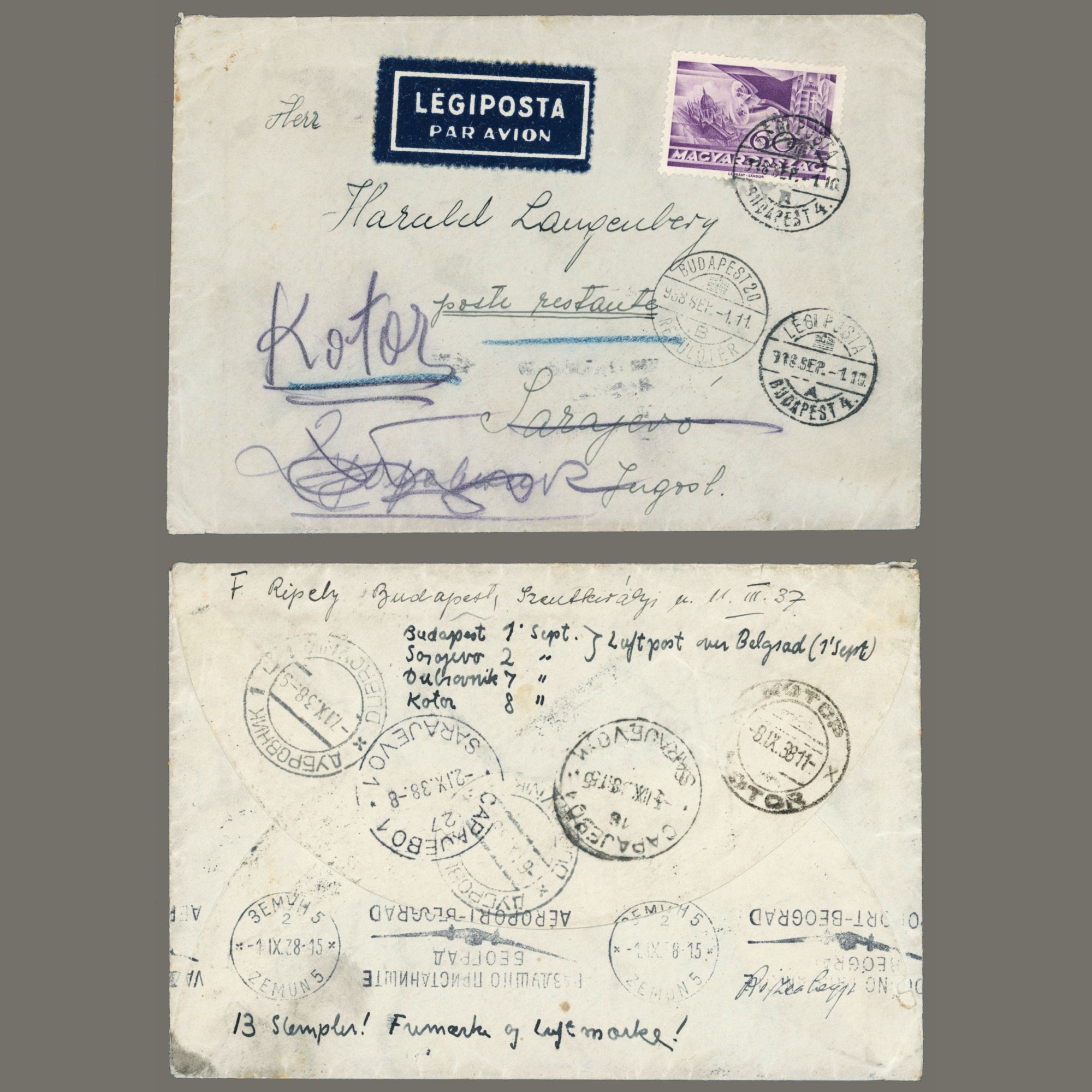 1938 Hungary – airmail cover sent to Yugoslavia, first to Sarajevo and then to Kotor