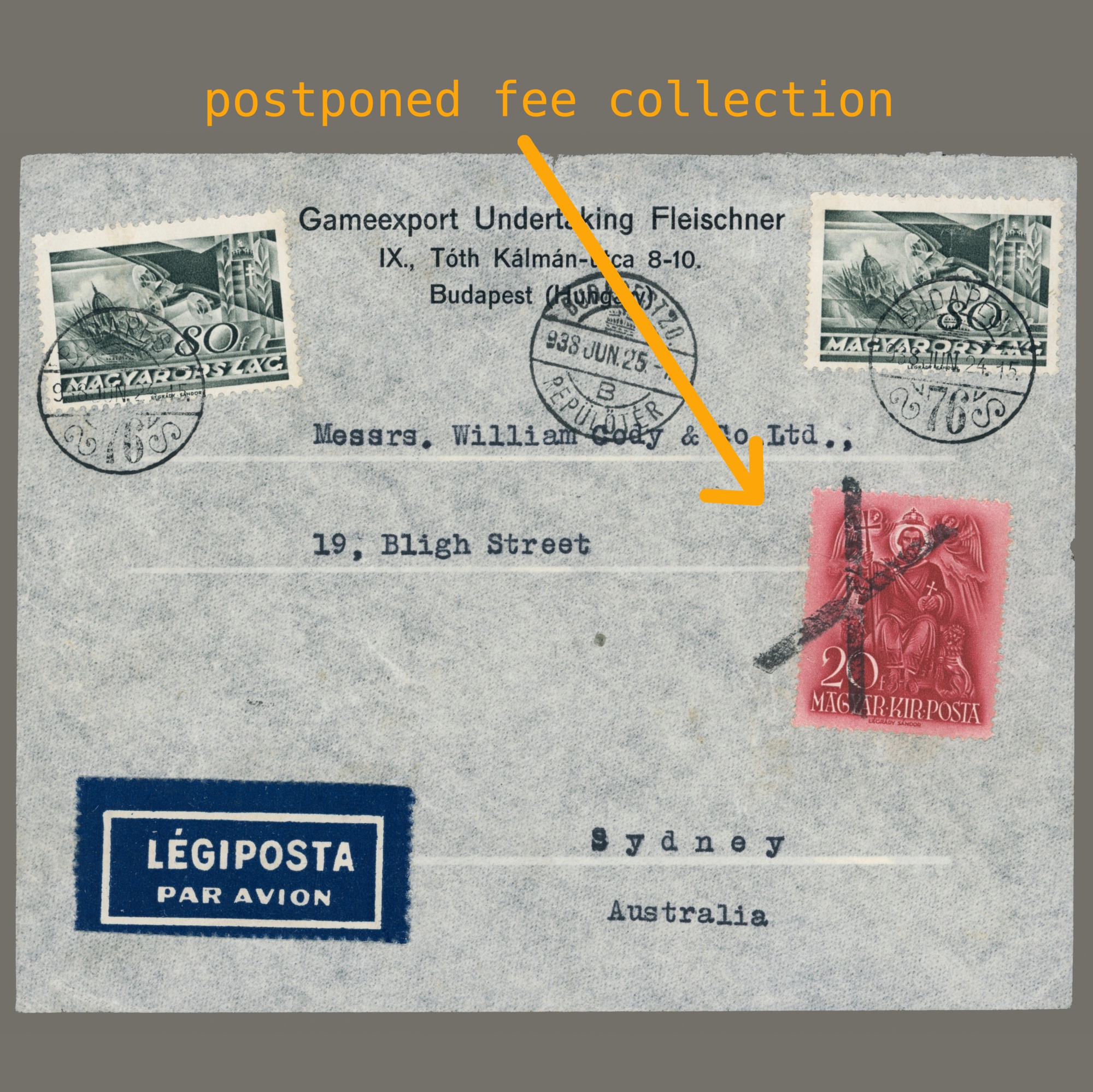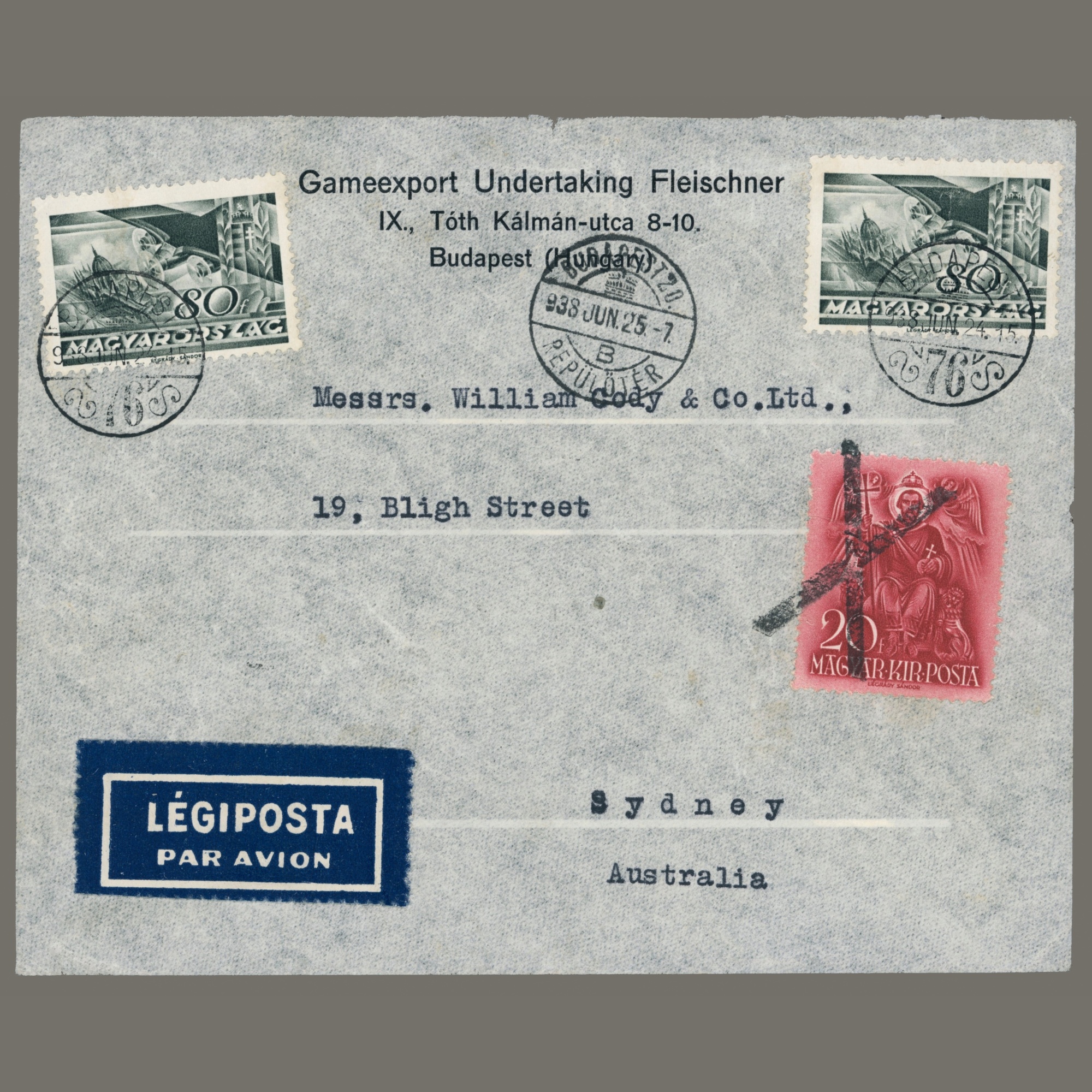 1938 Hungary – Airmail letter sent to Australia – the paid 1.60 Pengo postage was insufficient, so the 20 filler shortfall was added en route and the difference collected later from the sender.