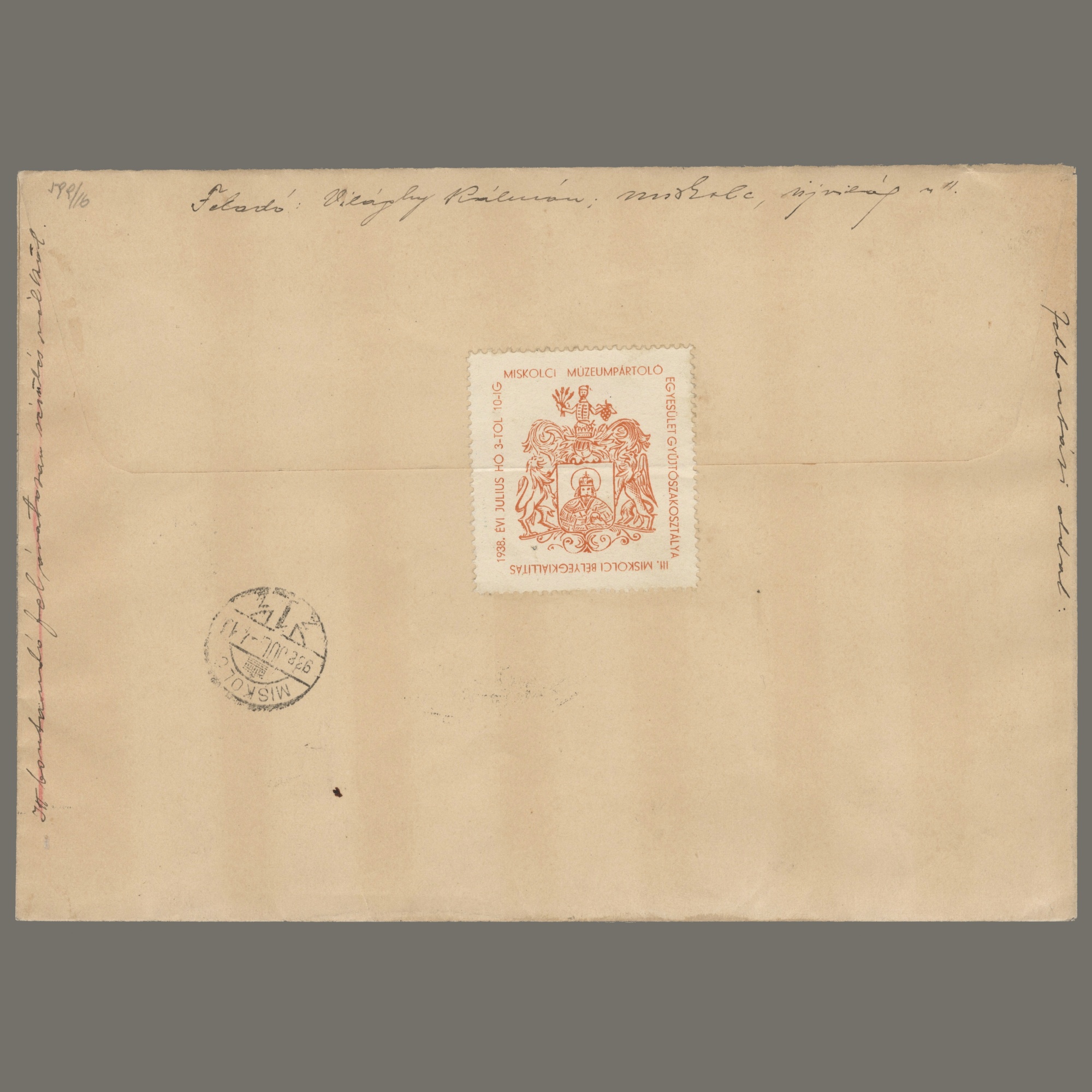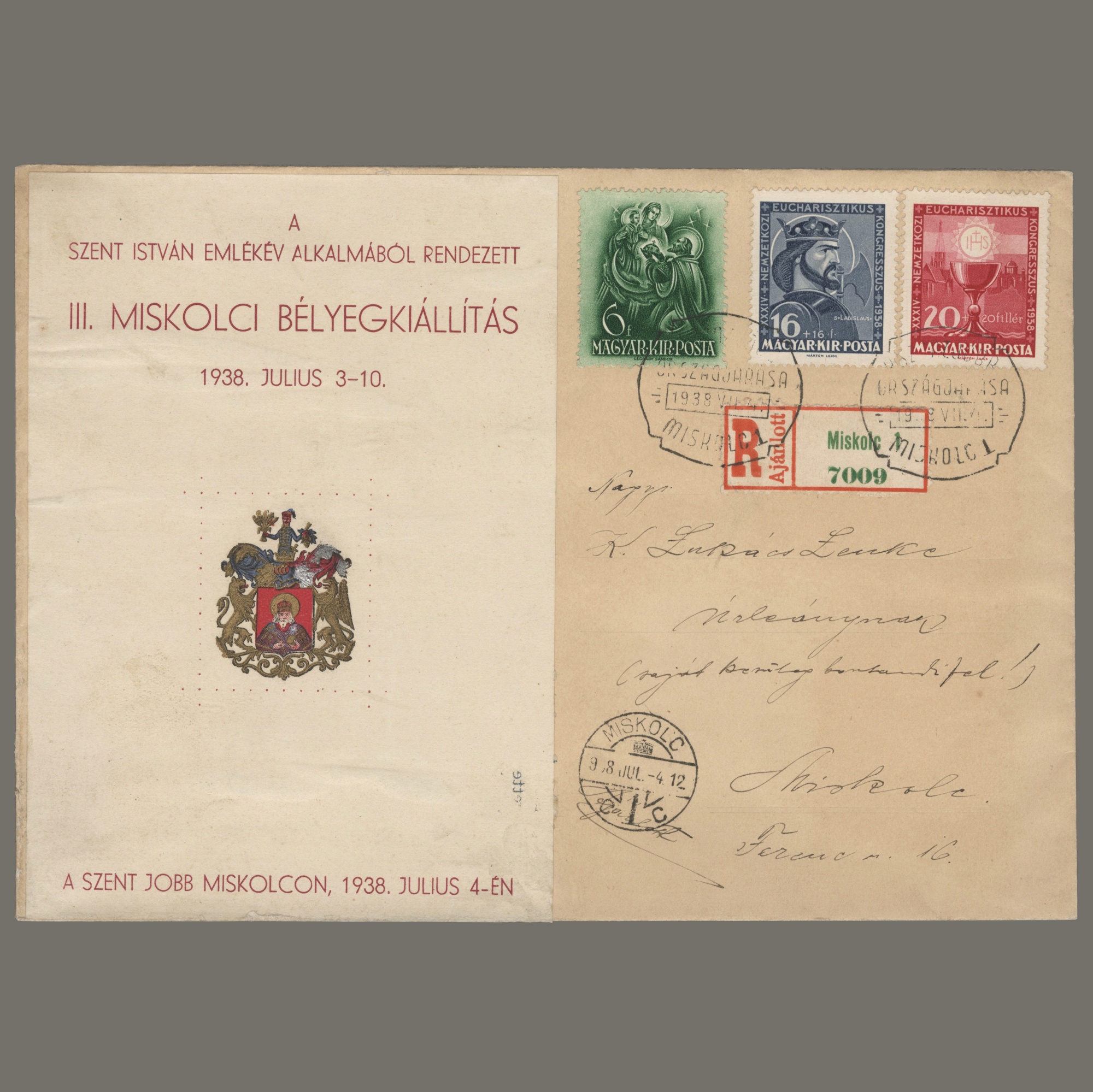 1938 Hungary – III. Miskolc Stamp Exhibition – large size cinderella stamp on a registered mail