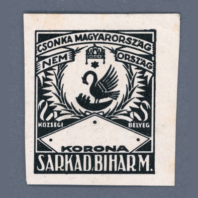 • 1922 Hungary – proof of the Sarkad city revenue stamp – black print on chalk-paper. Unknown in literature!