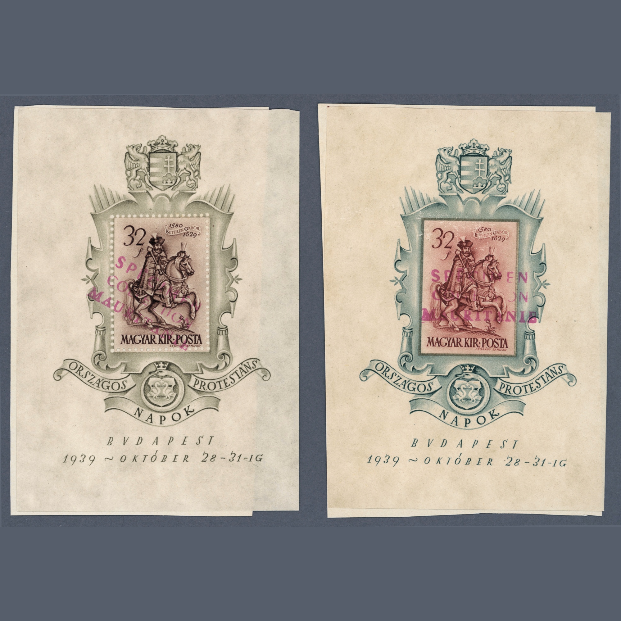 1939 Hungary – Pair of Bethlen miniature sheets with overprinted Mauritanian UPU specimen, exciting speciality
