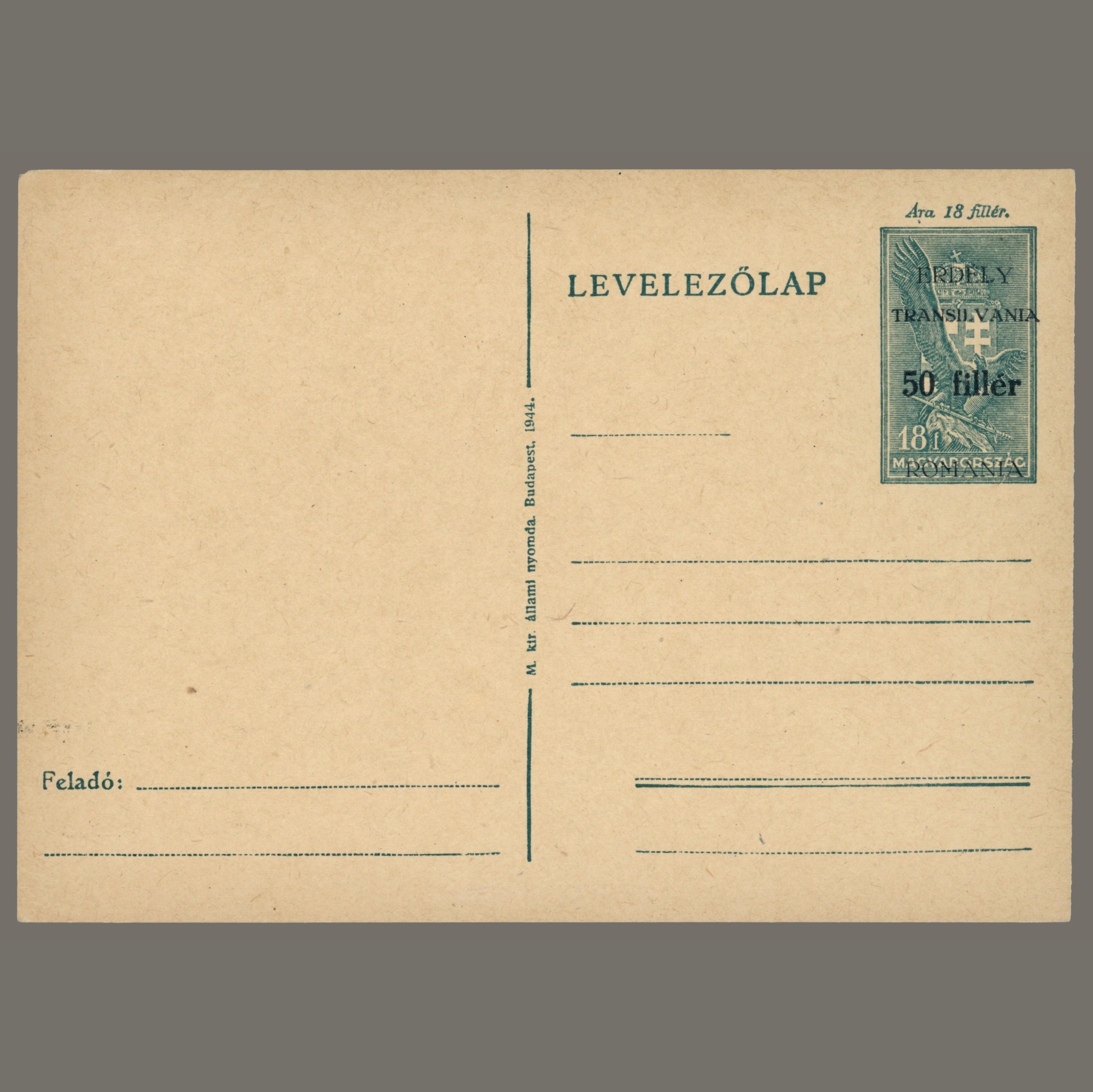 1944 Romania – Odorheiu Secuiesc (Székelyudvarhely) overprint on Hungarian postal stationery postcard | Prüf: Suvak