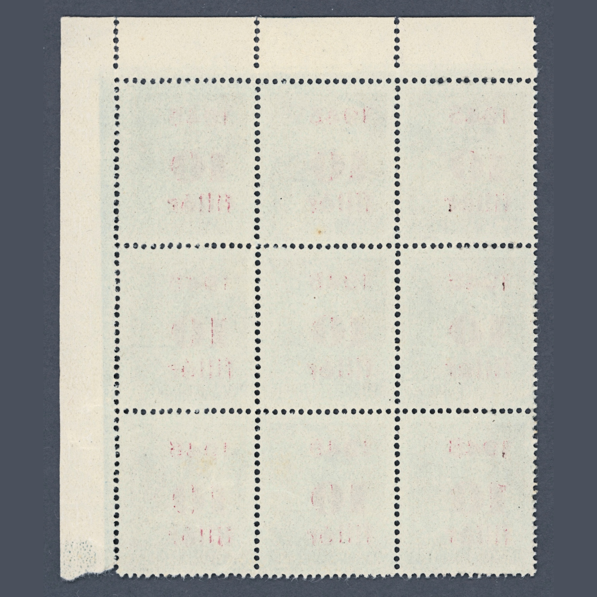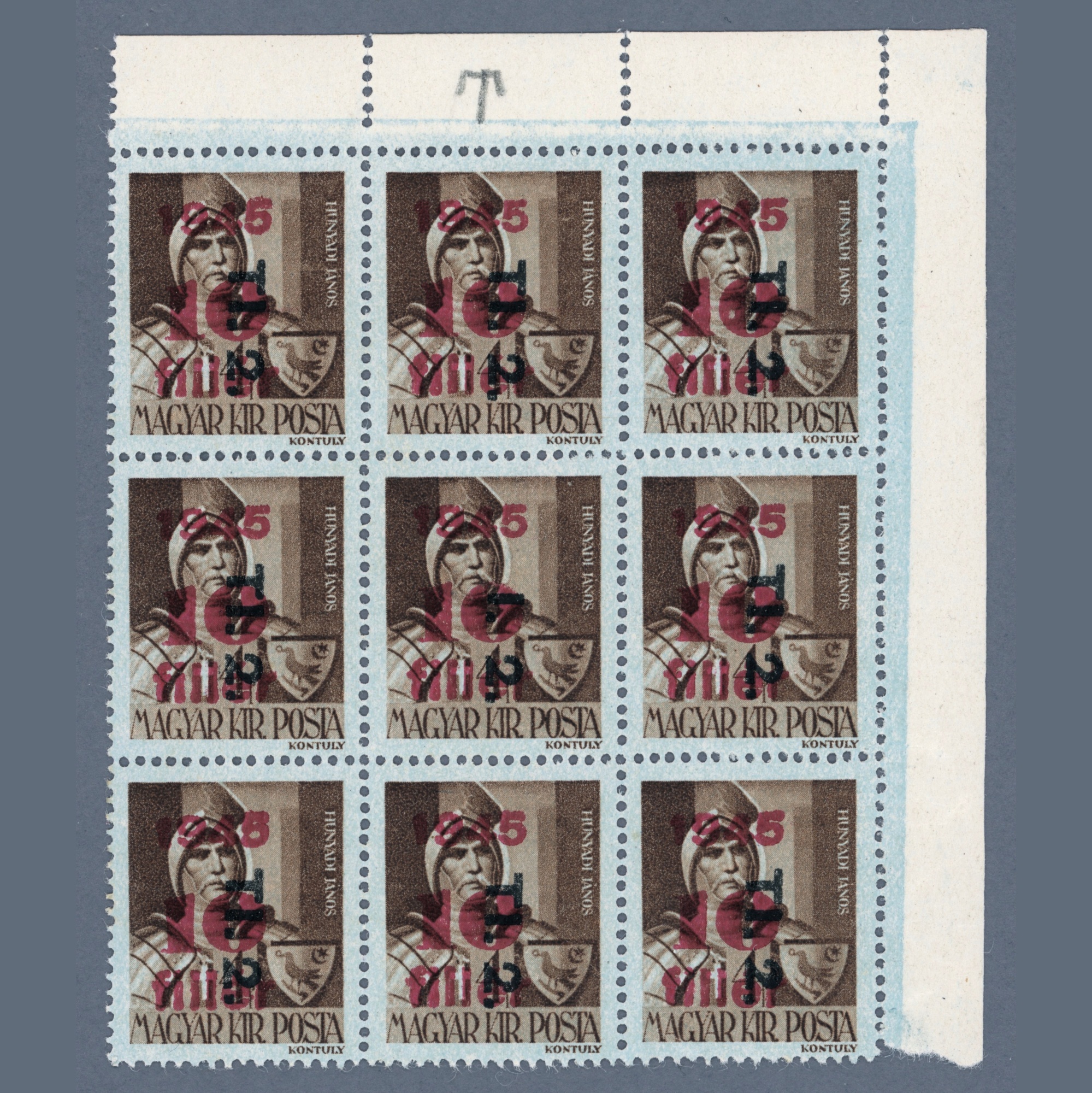1945 Hungary – Non-dominated stamp Tl. 2. mint never hinged blocks of nine, the middle stamp’s overprint is without the “T” | Phu: 38++ EUR