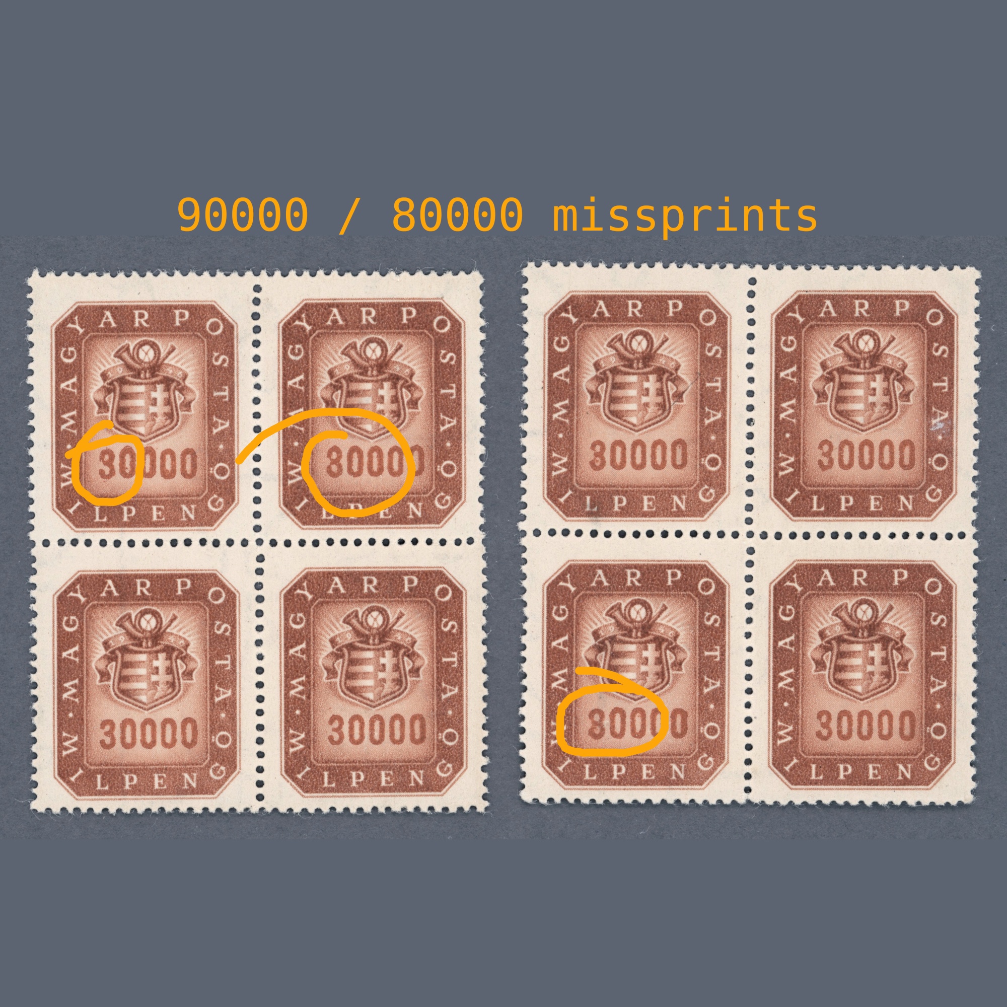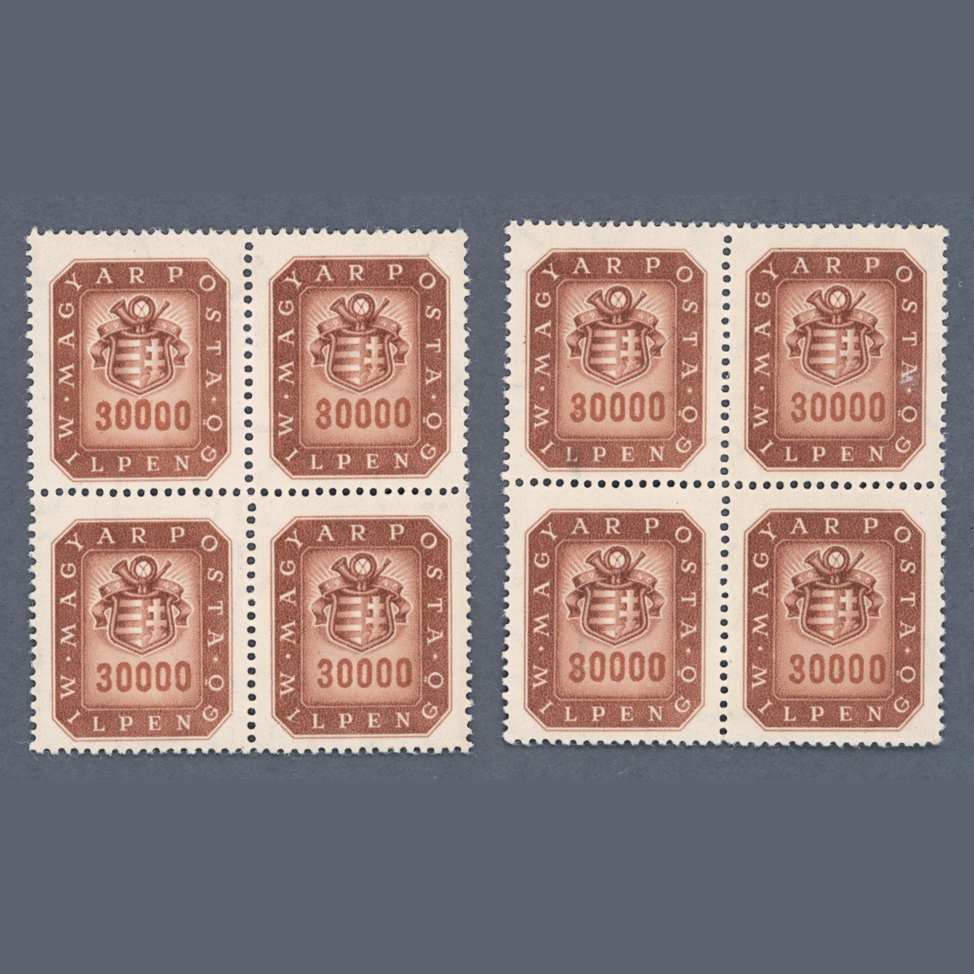 1946 Hungary – 30.000 Millpengő in mint blocks of four as 80.000-90.000 misprints