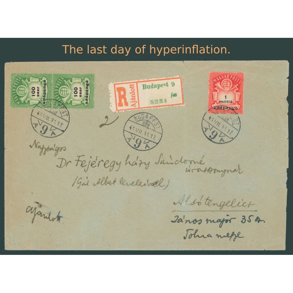 1946 Hungary – On 31 July, at 5 p.m., a registered letter was sent from Budapest to Alsótengelic in the last hours of hyperinflation.