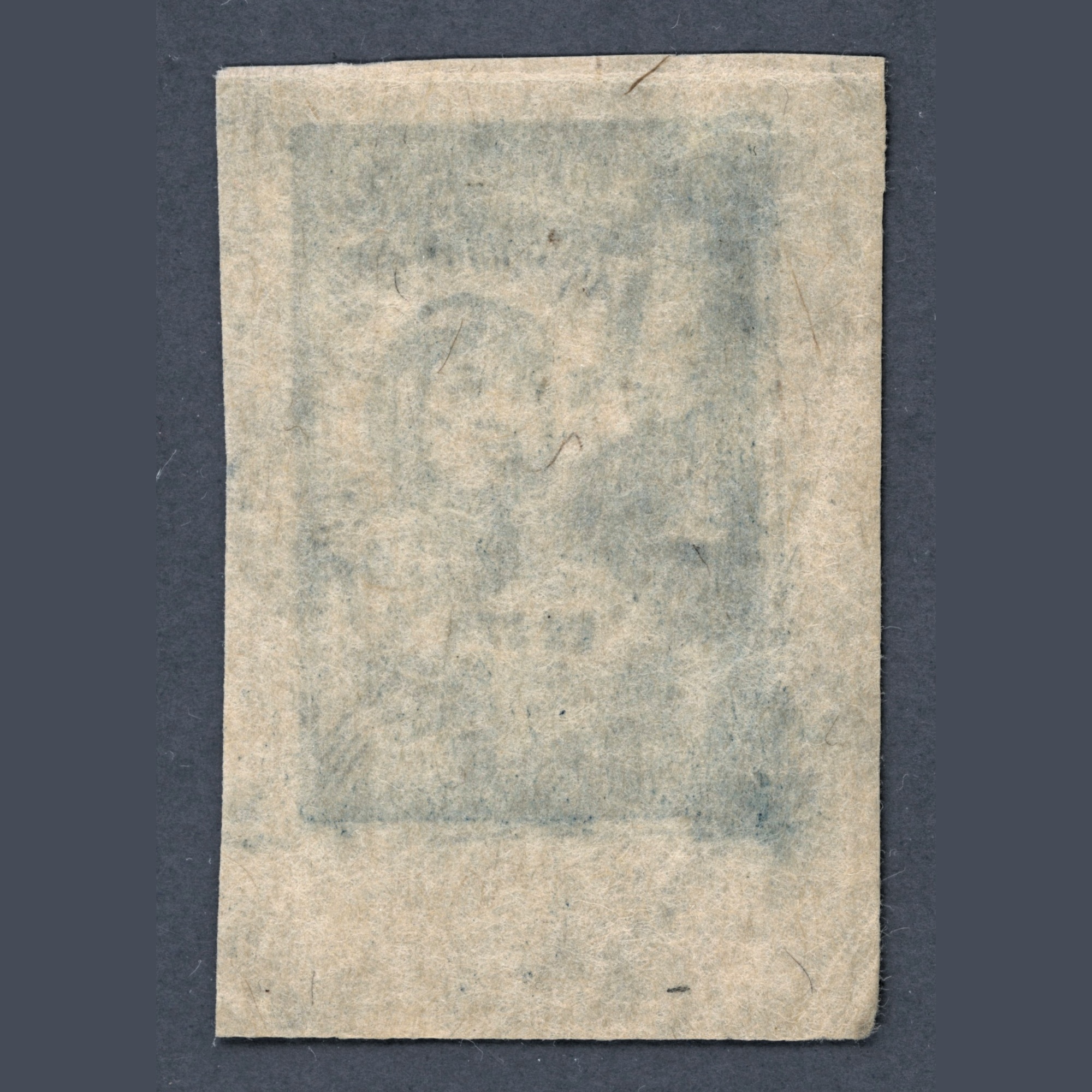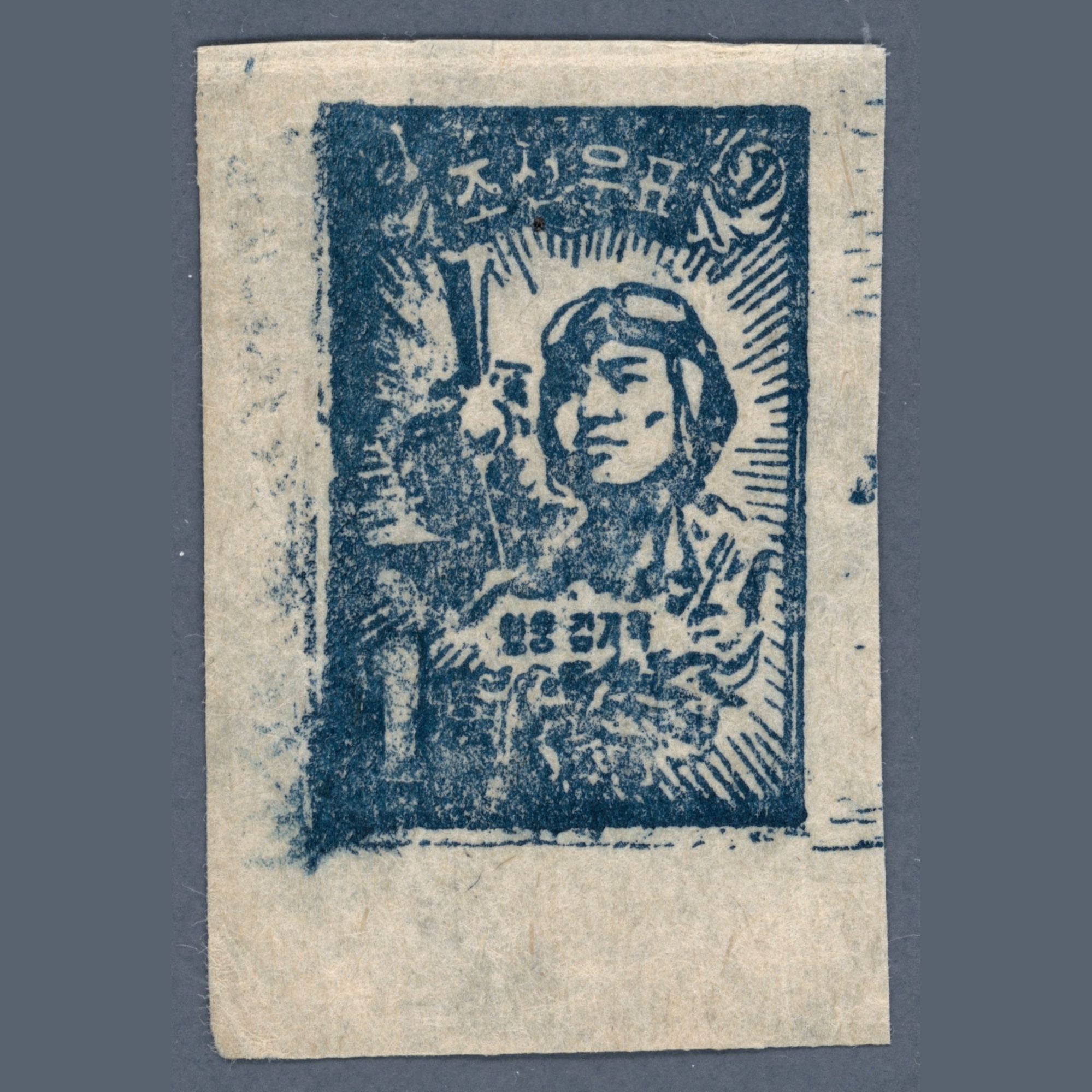 1951 North Korea – “Hero Kim Ki Ok” imperforated 1 won stamp. Sheet corner print with paint smudging – misprint | KSC: 36++ USD