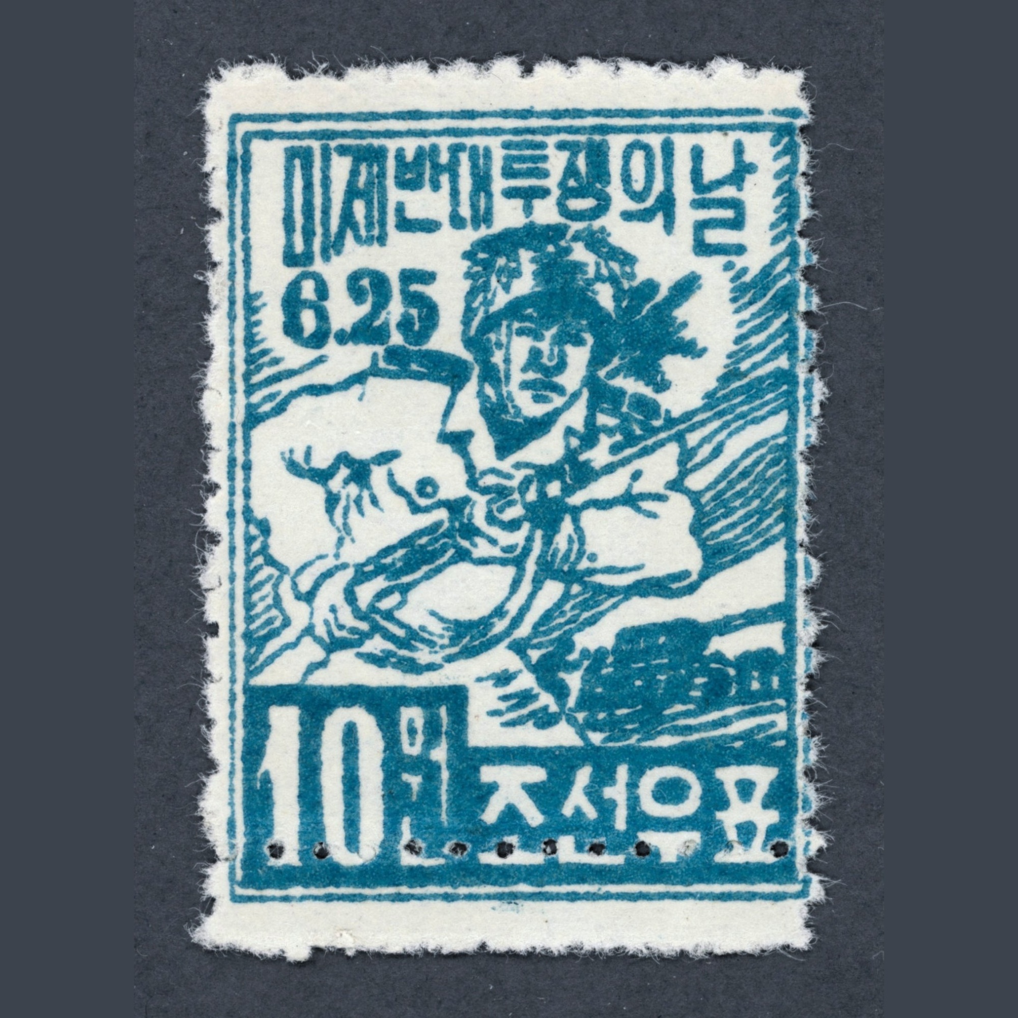 1953 North Korea – “Day of Anti-Imperialist Struggle” original 10 won unused stamp, misprint: double-perforated at the bottom | KSC: 96 USD (the normal stamp)