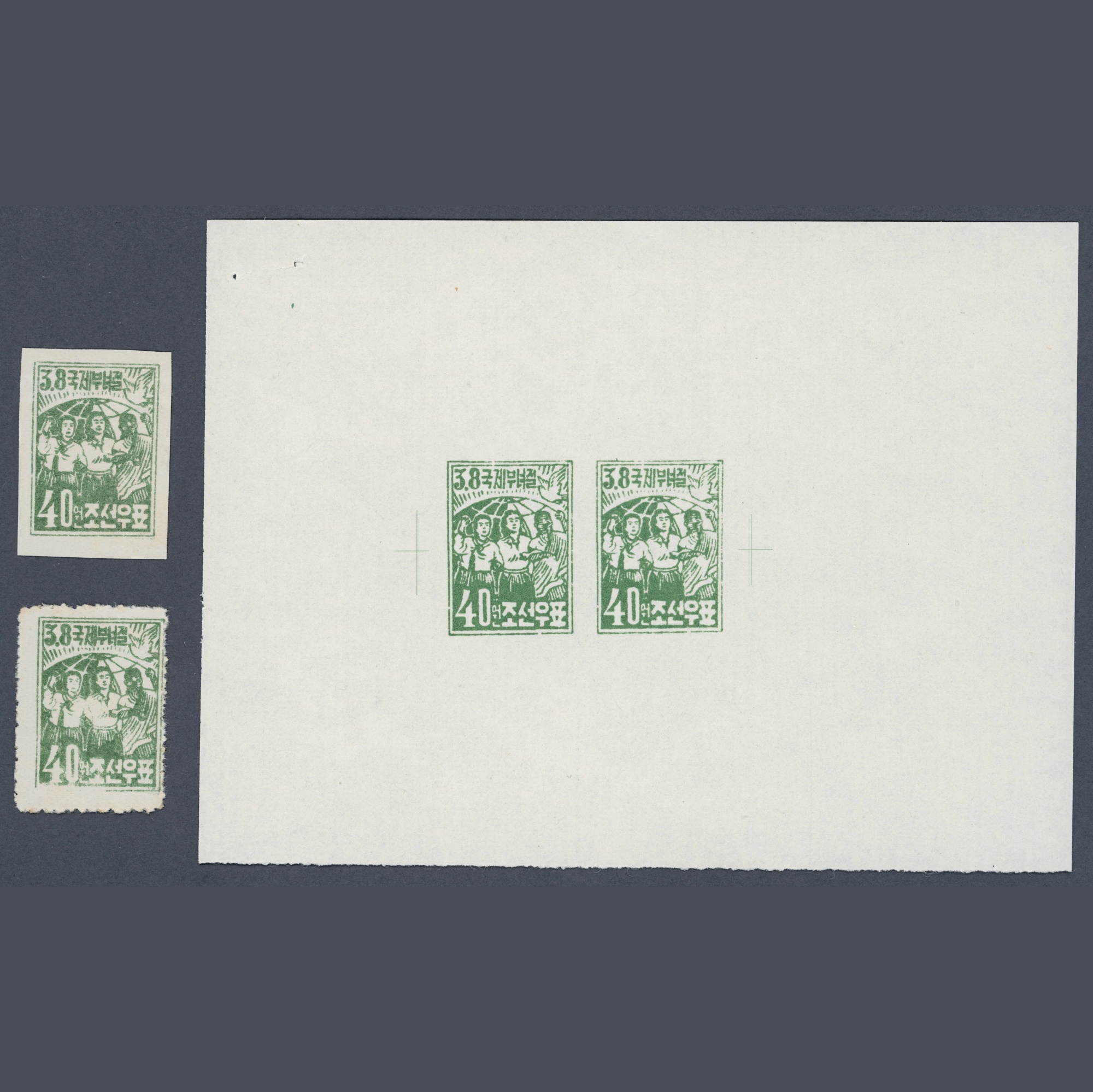 1953 North Korea - "International Women's Day" 40 won complete set: perforatied, imperforated and two-picture proof