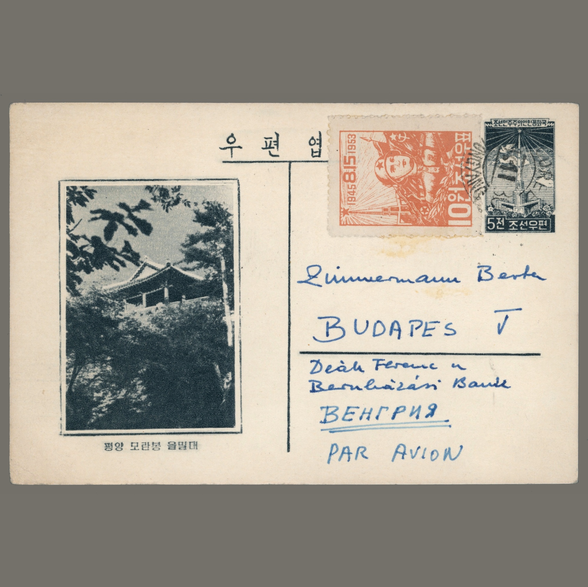 1955 North Korea – Rare postal stationery sent as airmail postcard to Hungary, with 1953 “Liberation of Korea” stamp reprint