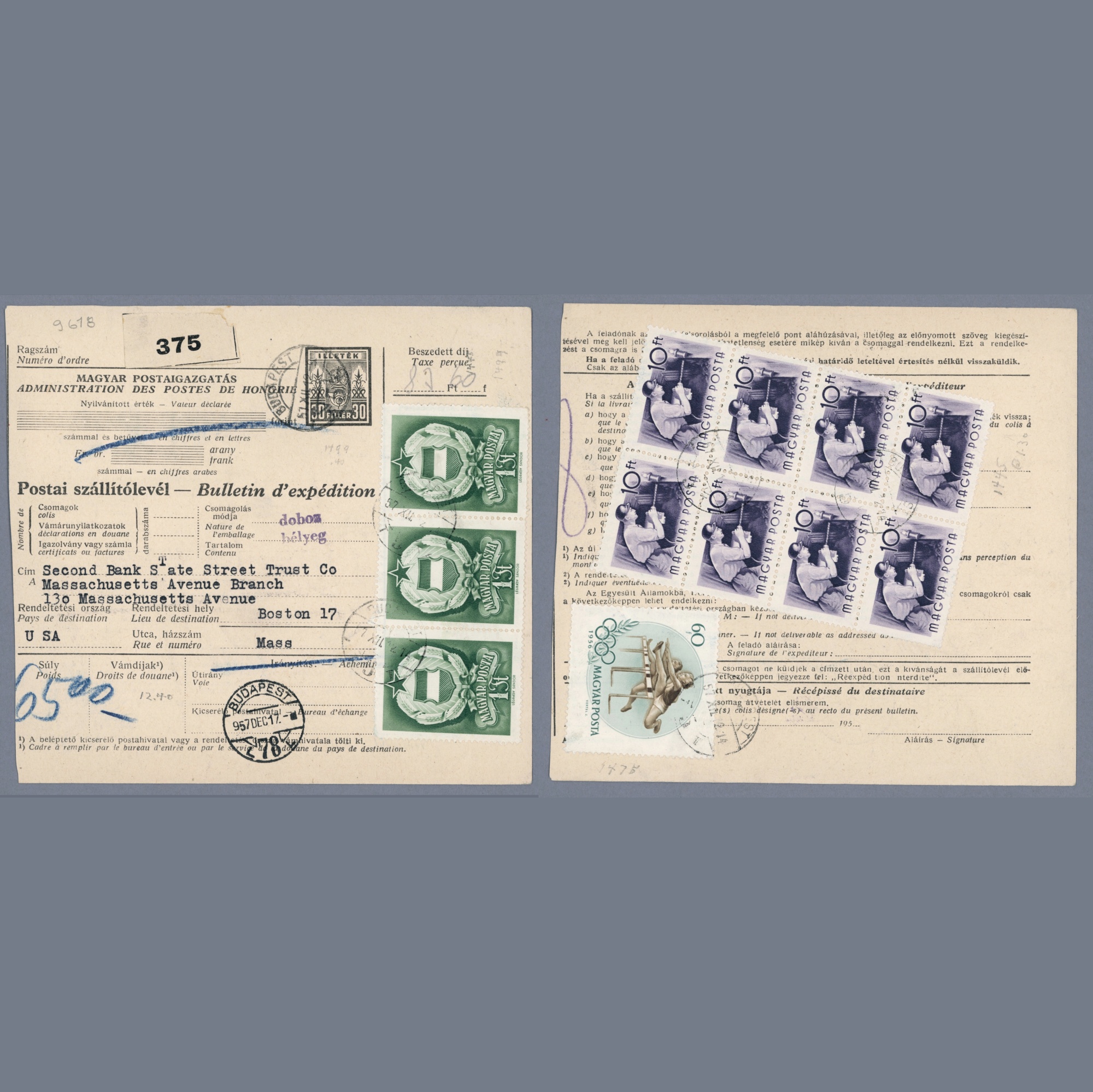 1957 Hungary – parcel card sent to the USA with a 6.5 kg parcel, postage was extremely high 83.60 HUF – include Occupations 10 Forint in a block of eight!