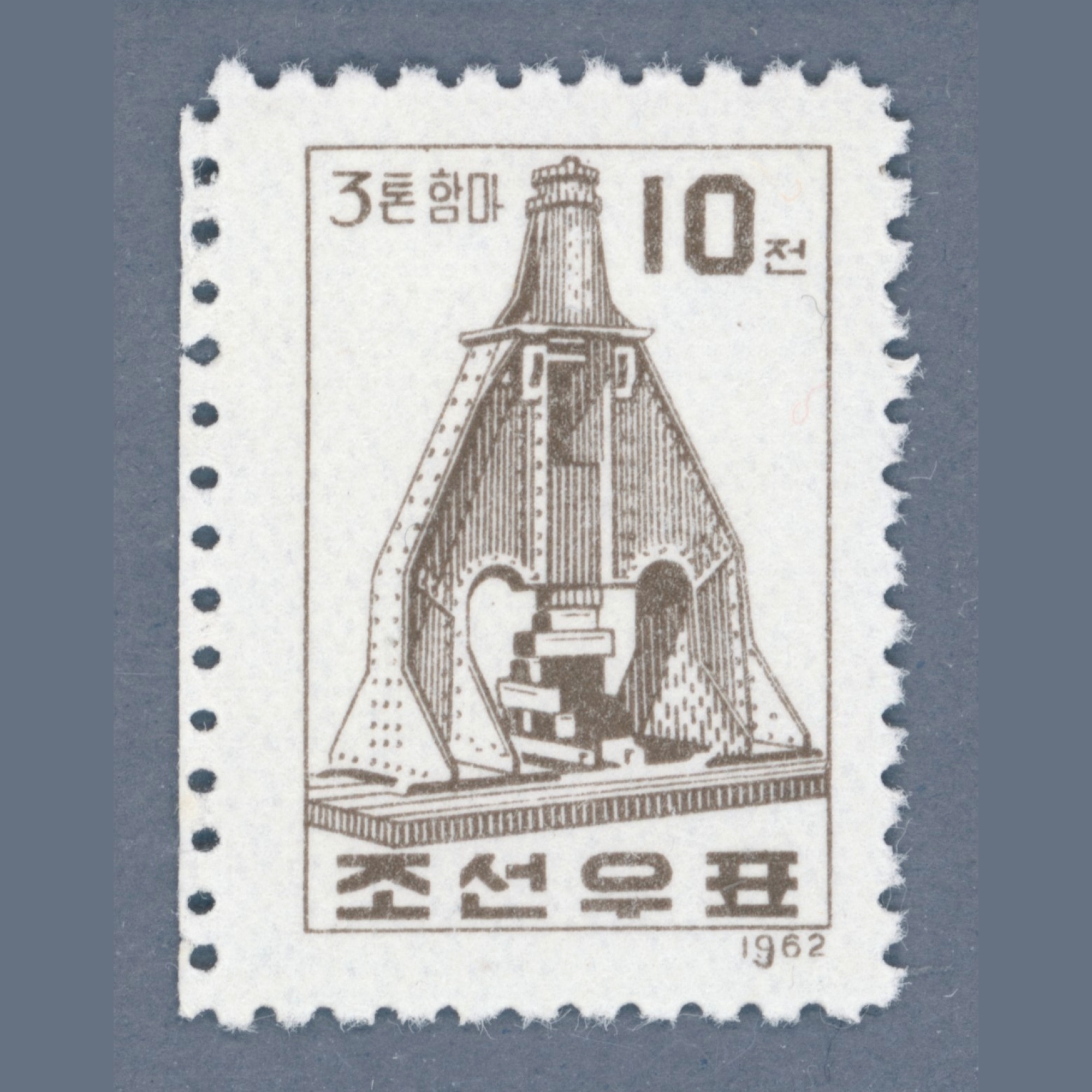 1962 North Korea – “3-ton Air Hammer” in brown, misprint: the year number “9” is retouched | KSC: 165 USD (price of the base stamp)