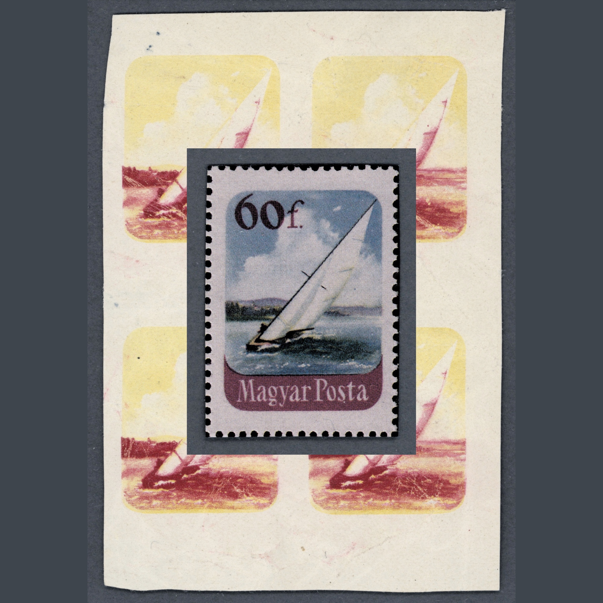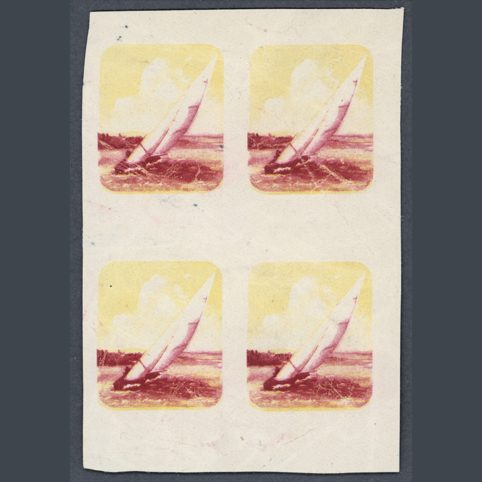 1965 Hungary – Block of four color-proof of the unissued Balaton stamp on worn paper without watermark.