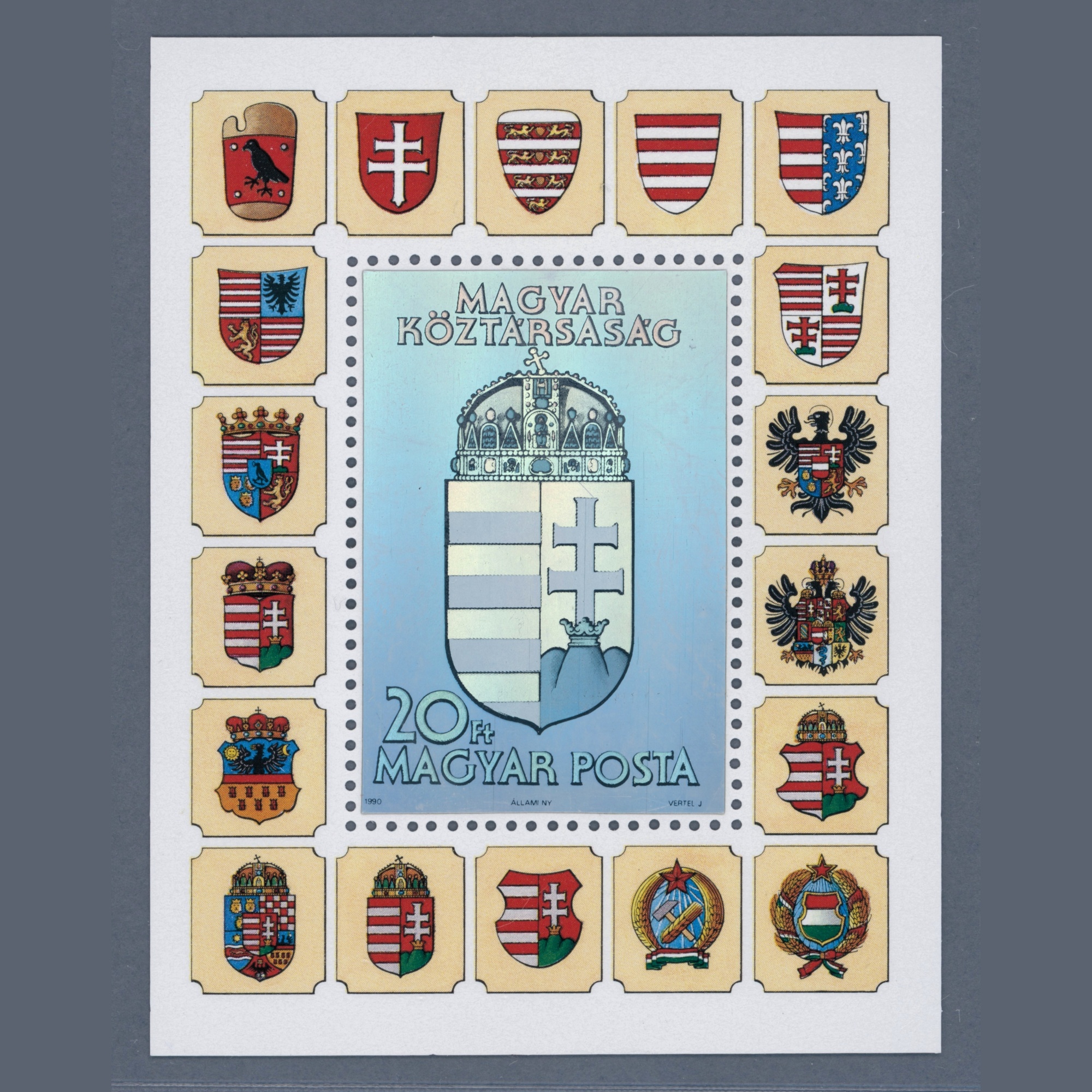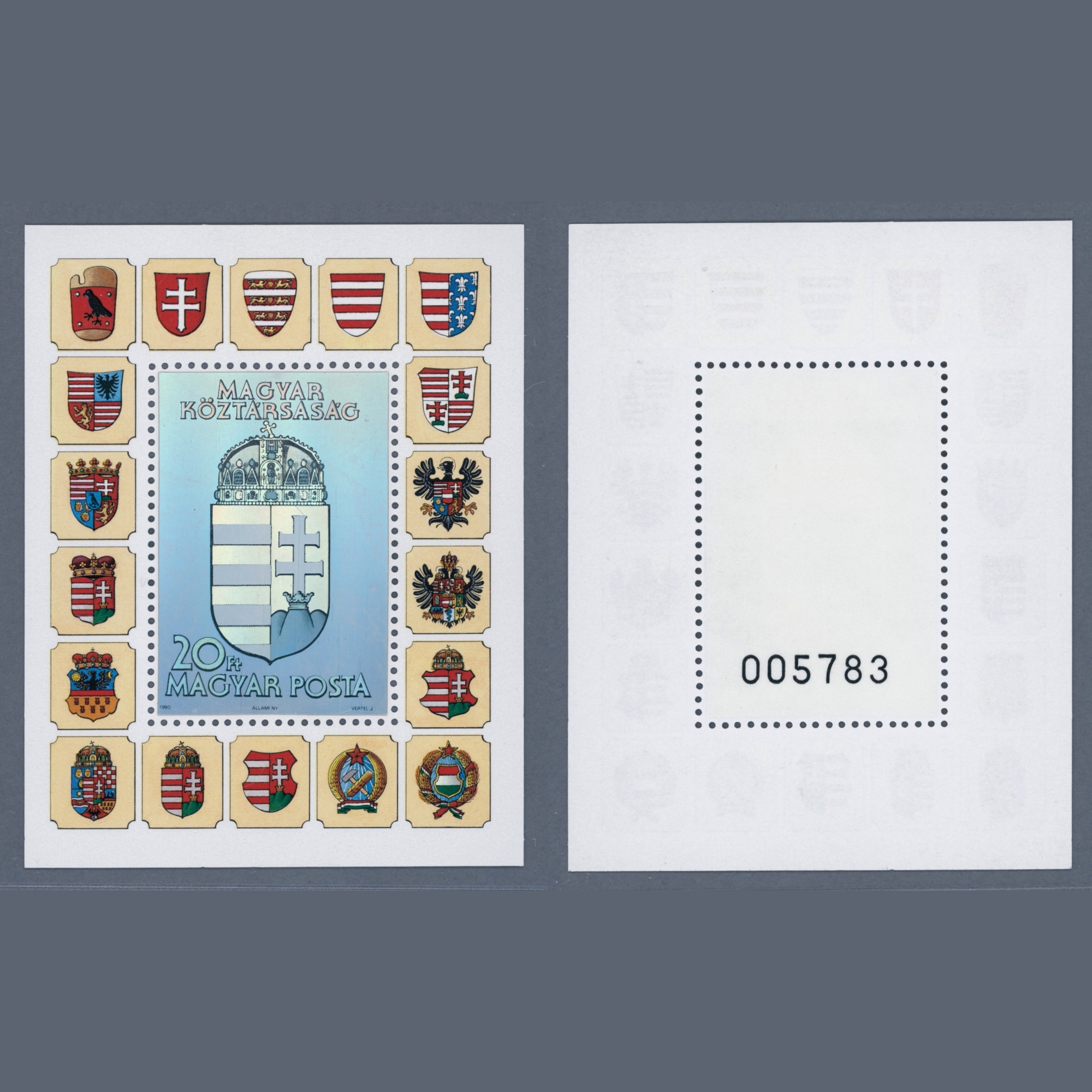 1991 Hungary – Coat of arms of the Republic of Hungary mint never hinged ** holographic minisheet with black serial number | Phu: 4123 / 150 EUR